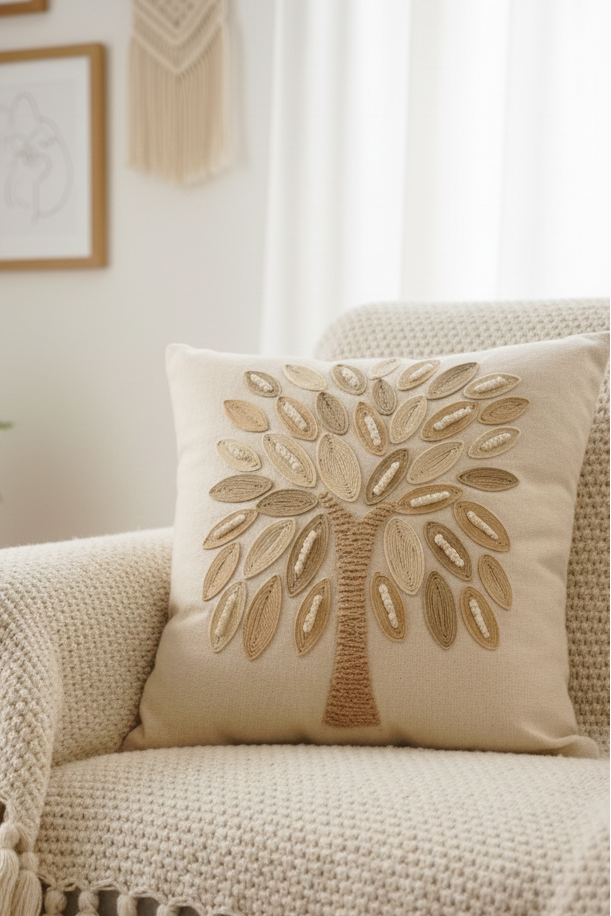 The Tree of Life Cushion brings to life the timeless symbol of growth and grounding , the tree through a tactile and structured embroidery technique. The soft neutral base acts like a canvas, letting the layered leaf motifs in earthy tones radiate from the trunk like concentric rings of nature itself. The tree of Lifeis a universal concept symbolizing interconnectedness and the cycle of life. It’s a cushion that doesn’t just decorate; it tells a story of roots and renewal, making it a soulful accent for artisanal interiors.