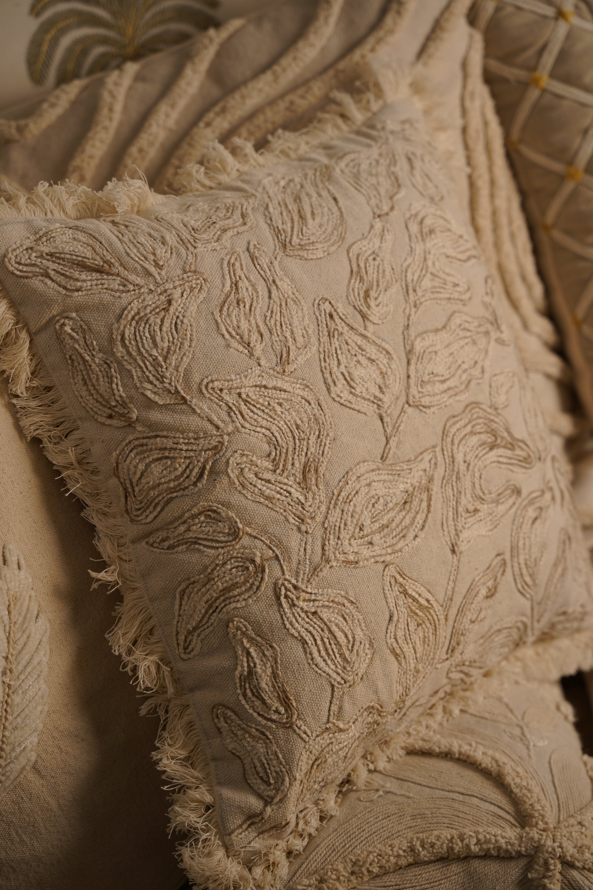 The Leafline Cushion draws inspiration from the quiet elegance of foliage, interpreted through fine linework. Its tactile raised embroidery creates soft shadows that shift with light, giving the surface a sculptural dimension. Paired with delicate fringed edges, the design celebrates subtlety and craftsmanship, a timeless accent for neutral, layered interiors.