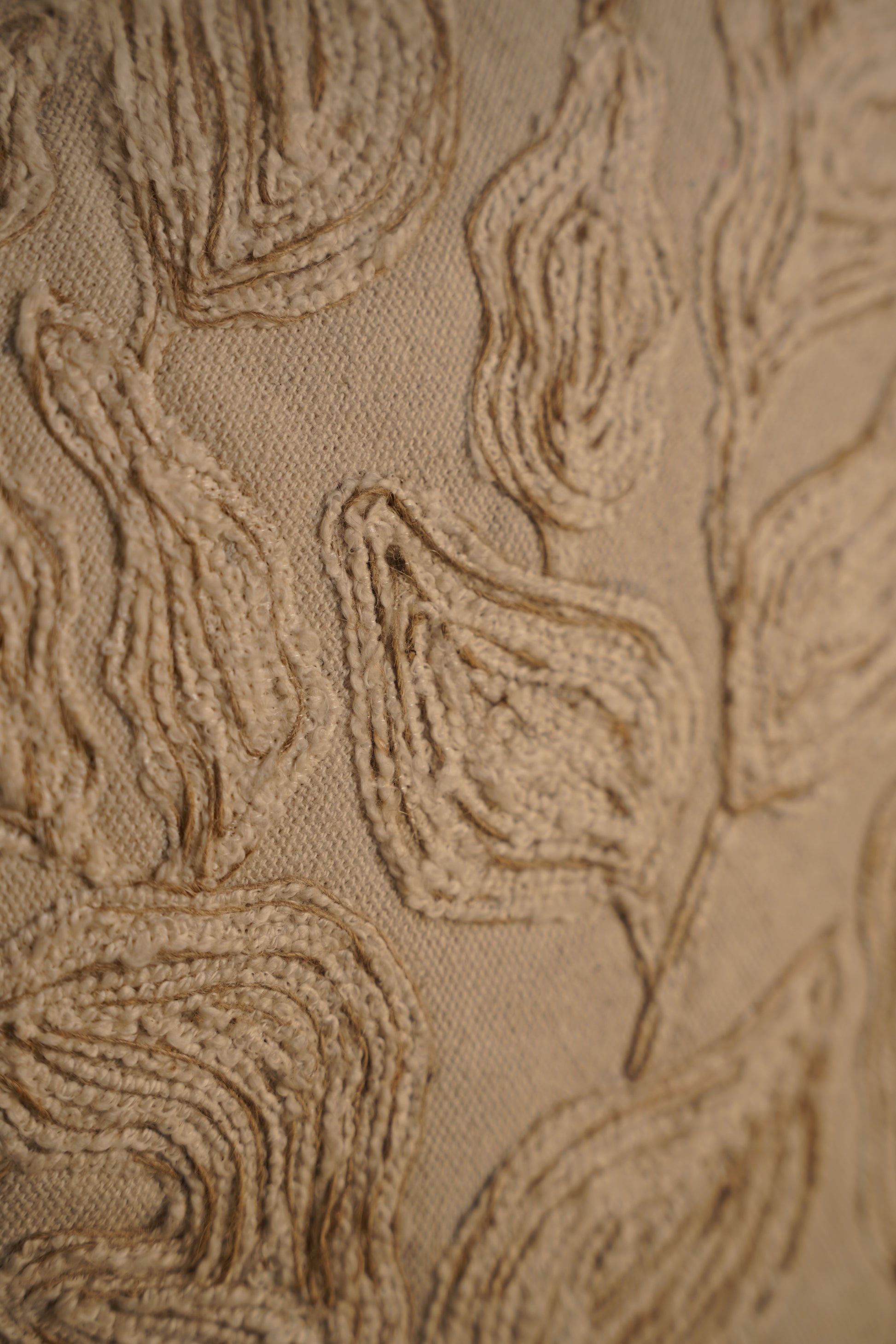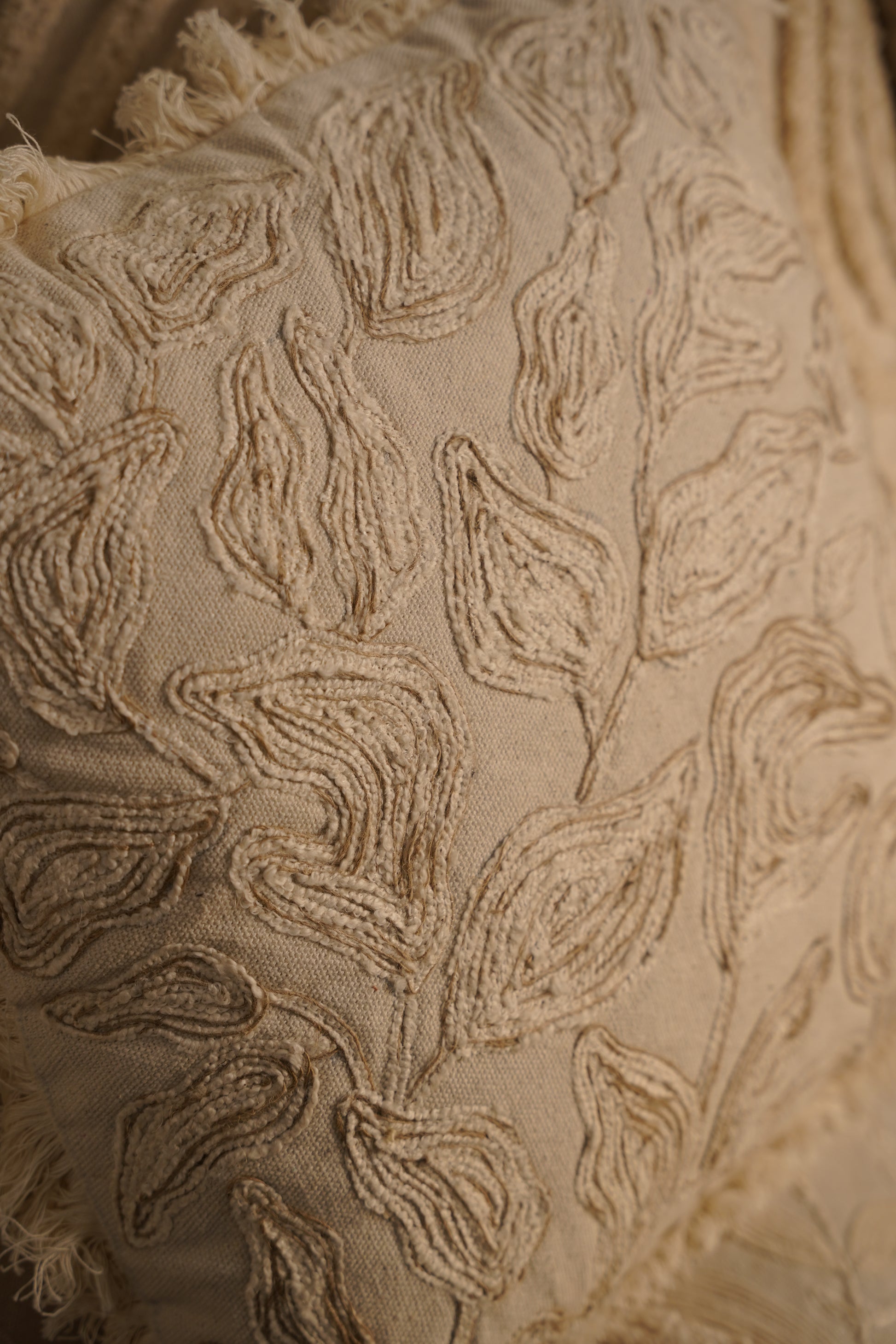 Artisans meticulously outline each leaf motif using fine cording and raised chain stitches, carefully following the flowing natural shapes. Multiple passes of thread build up each contour, resulting in a pronounced linear relief that mimics leaf veins. The surrounding edges are hand-fringed to soften the structure, requiring even pulling and trimming by hand for a uniform border. The combination of structured embroidery and soft fraying showcases controlled handwork at its finest , blending organic imperfection with technical precision.