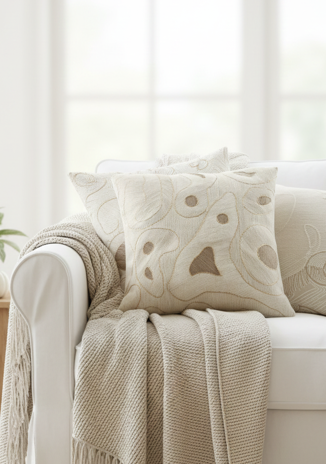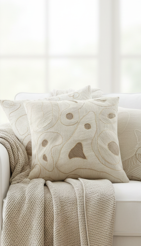 Craftmanship of the Product:-This cushion features a white fabric base adorned with intricate, abstract fish patterns inspired by the "Adorable Fish" motif. The designs are created using metallic thread, highlighting the whimsical fish shapes with a shimmering effect. This meticulous embroidery technique results in a visually captivating piece that combines elegance with a touch of nature-inspired artistry.