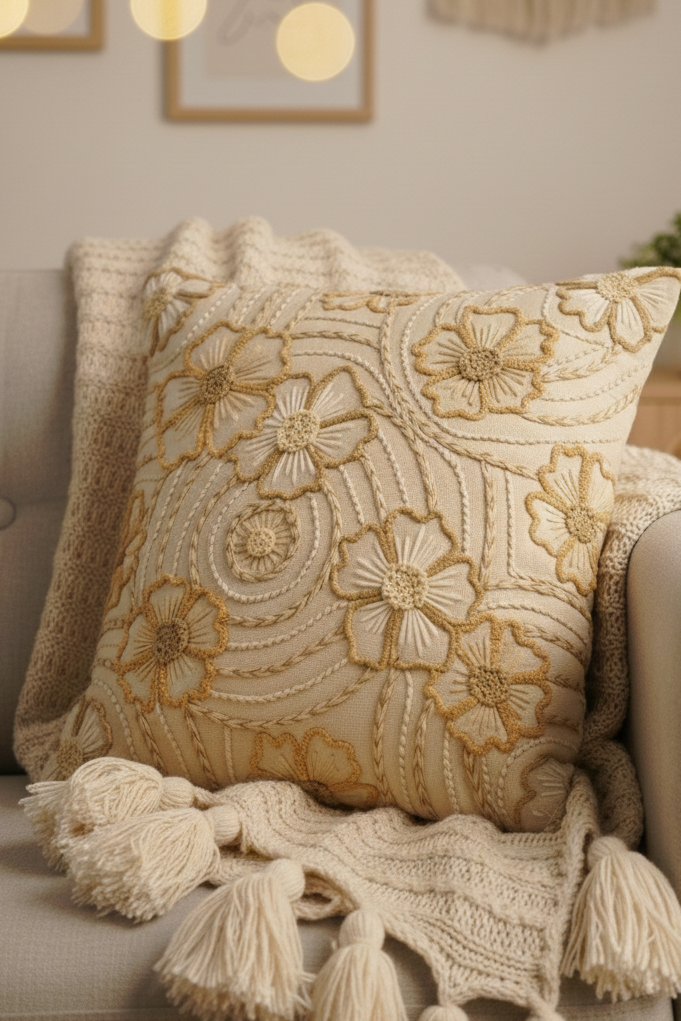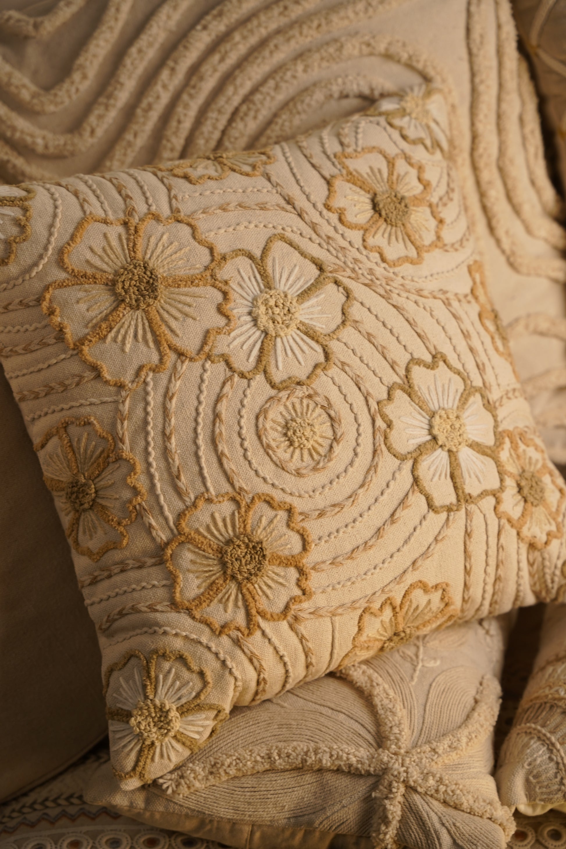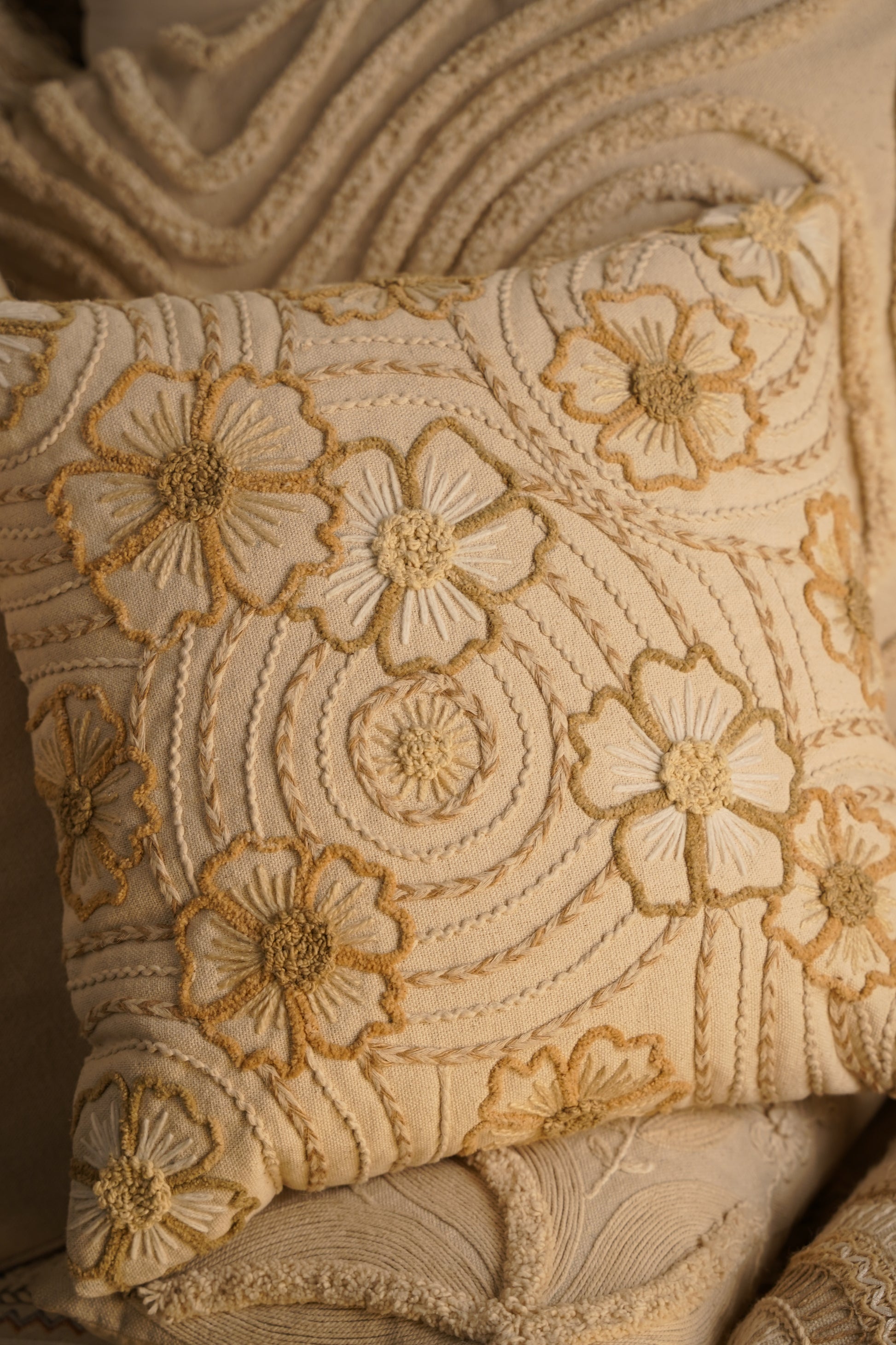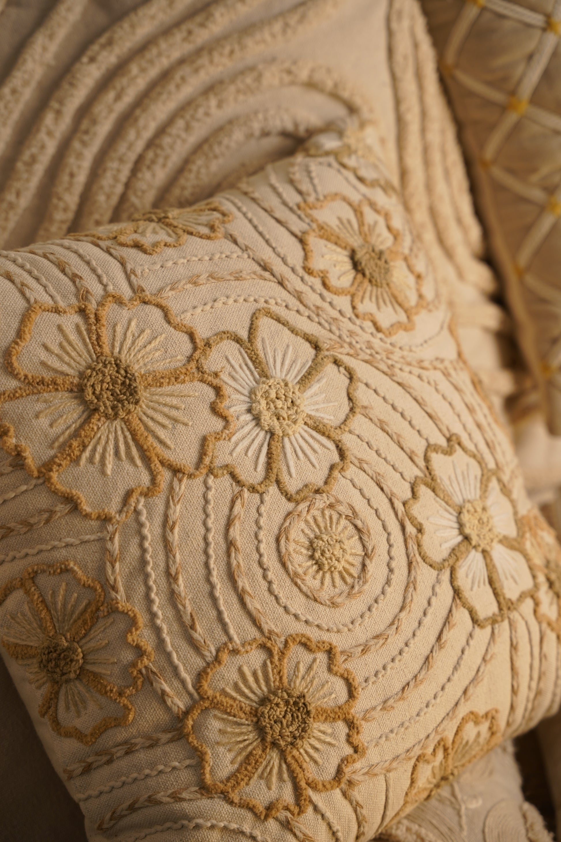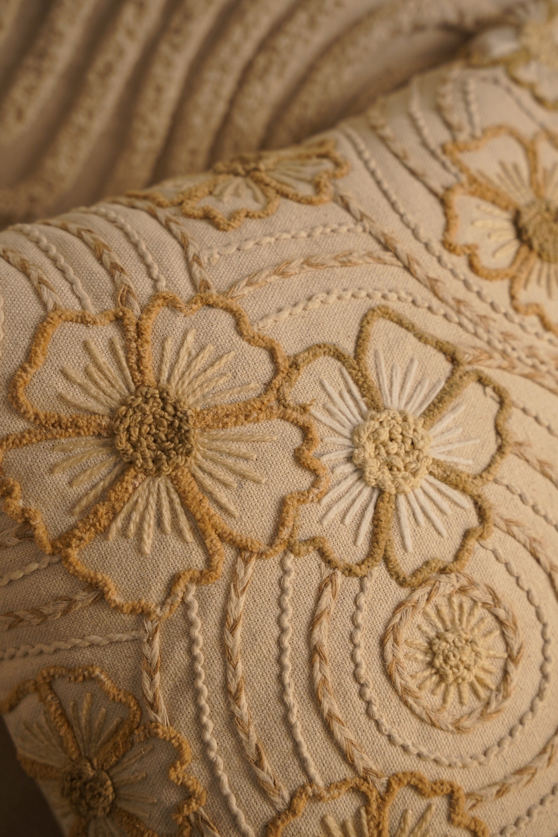 Artisans use a combination of cord embroidery and floral threadwork to bring this cushion to life. The concentric base is meticulously hand-laid using padded cord embroidery, ensuring perfect circular rhythm. Over this, each flower is individually outlined, filled, and padded with varying stitch techniques — including satin fill and French knots — to give texture and dimension. Maintaining symmetry while keeping the handcrafted feel demands precision and practiced skill. The result is a surface that feels sculpted, rhythmic, and tactile — a true testament to hand artistry.
