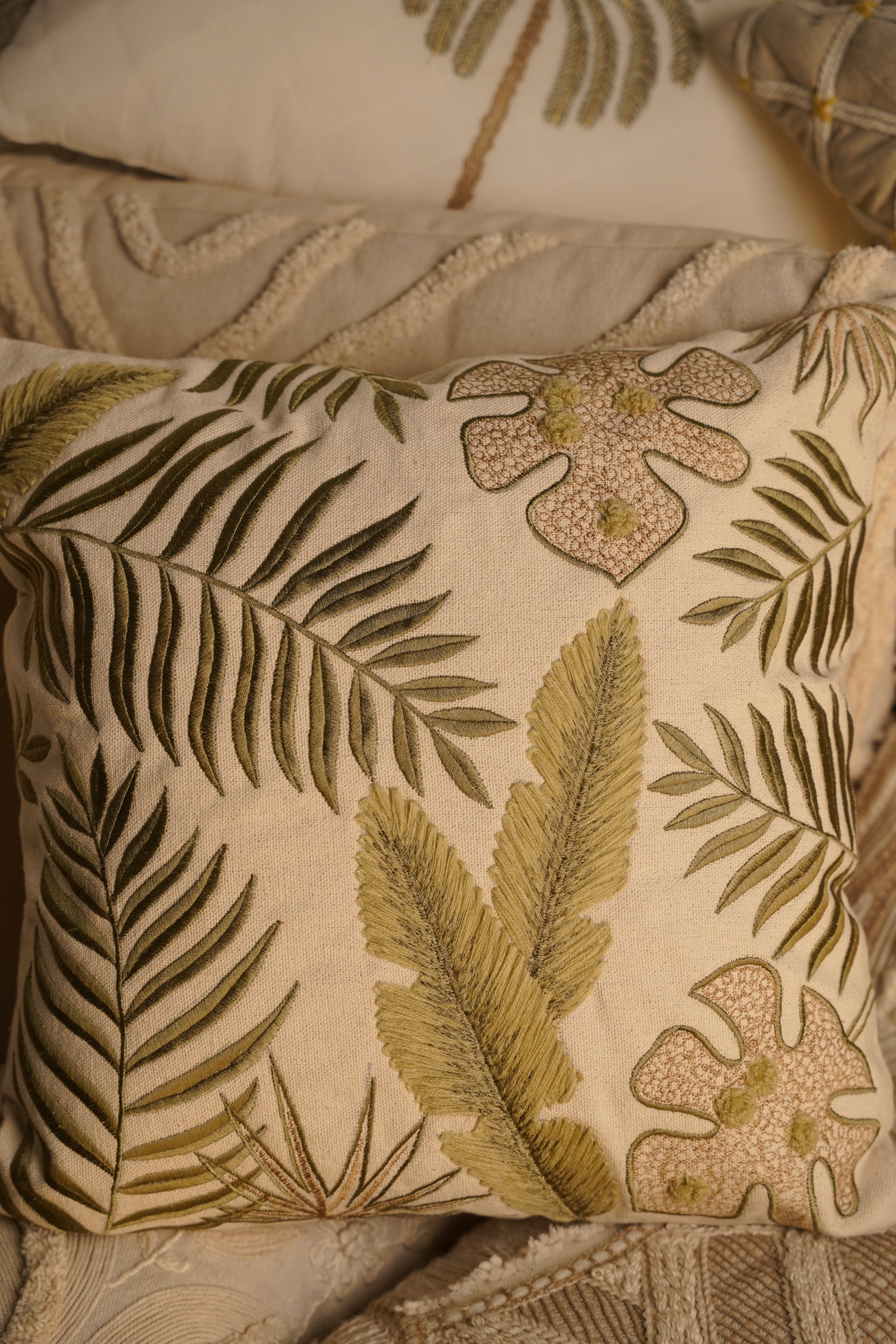 The Tropical Canopy Cushion is inspired by the soothing shade of dense green foliage and the serene rhythm of nature. The lush embroidered leaves evoke the feeling of being under a tropical canopy, where every leaf tells a story of quiet elegance. With its soft earthy greens and natural base, this cushion brings a refreshing, organic charm to interiors — perfect for both contemporary and boho spaces.