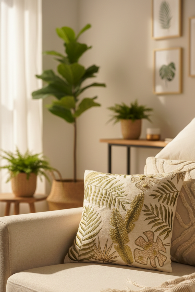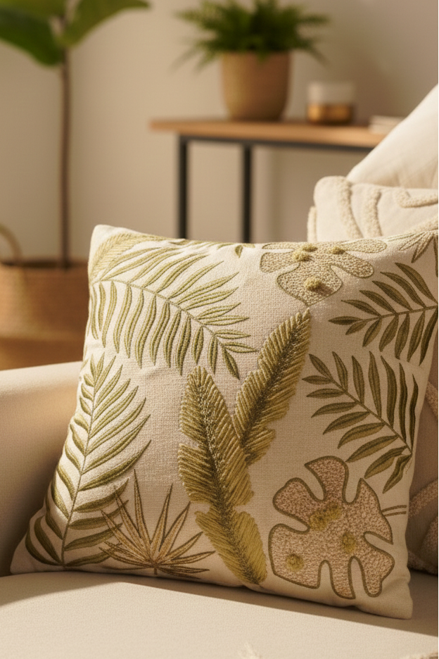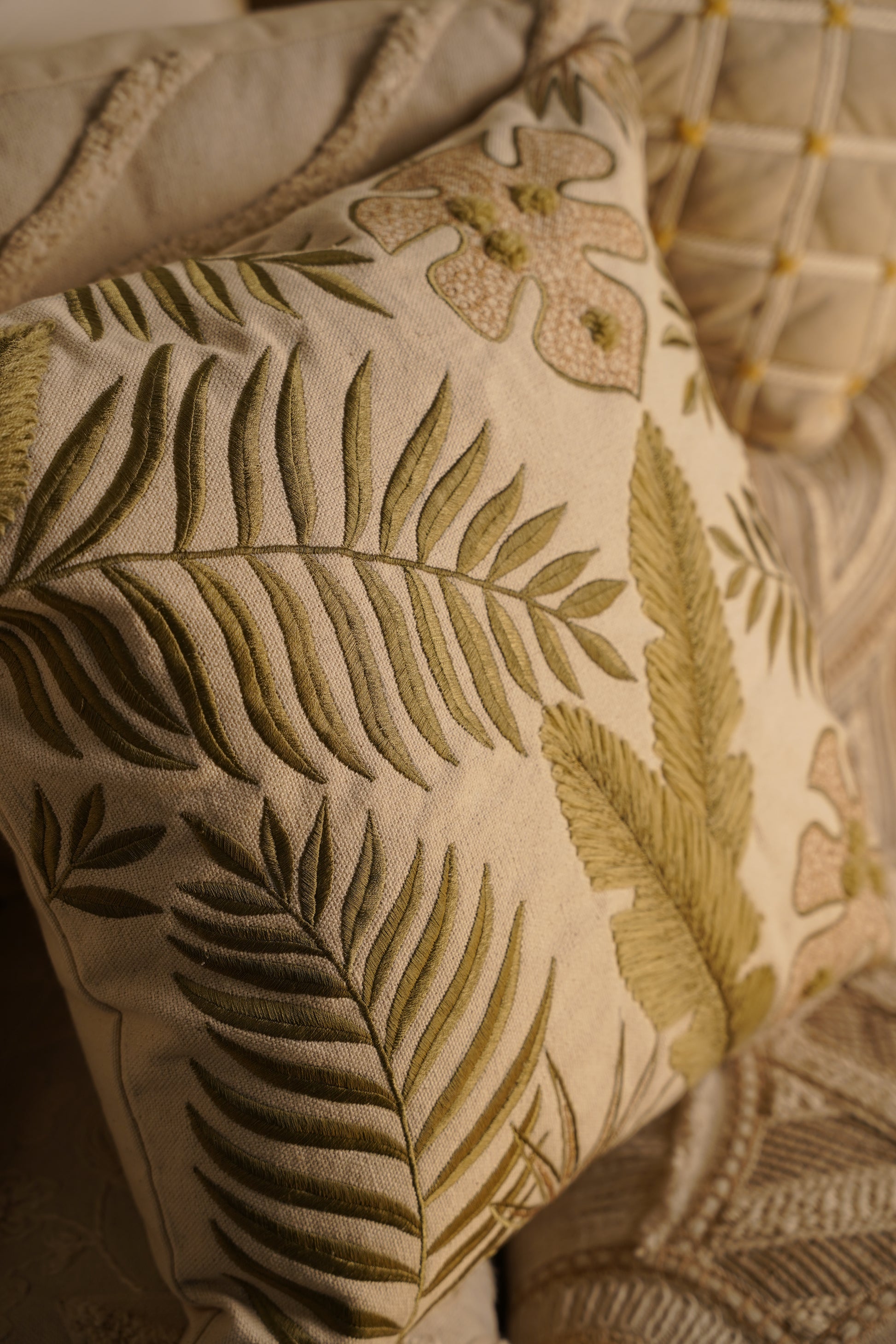 This cushion showcases exquisite embroidery using layered thread techniques to recreate the texture of real leaves. From the fine lines of ferns to the dense stitches of banana leaves and monstera, every element reflects the artisan’s precision. Techniques like satin stitch, long-and-short shading, and textured knotwork are used to give a 3D leafy depth. Crafted on a durable cotton base, this piece combines artisanal skill with timeless botanical beauty.