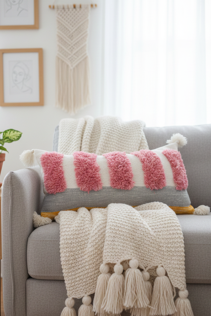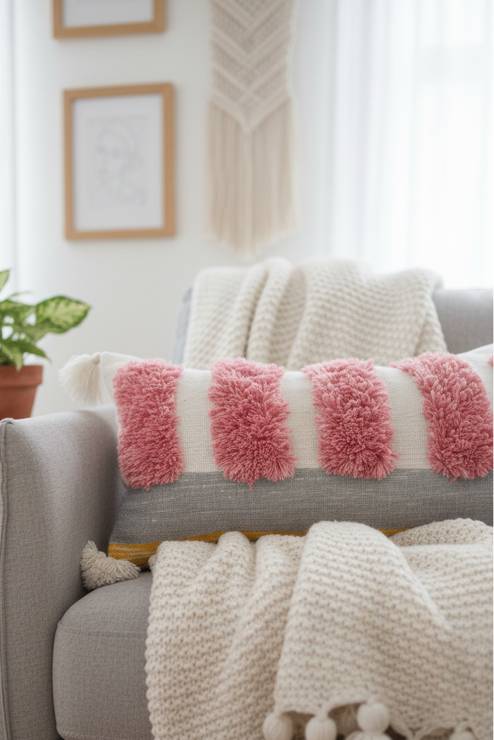 Story of the product: The pink hues of candy floss which we all savored as a kid is the prime inspiration of the artisans who had hand-tufted these pretty candy yarns on the pillow cover. Add a memoir of your childhood at your home with our candyfloss pillow.