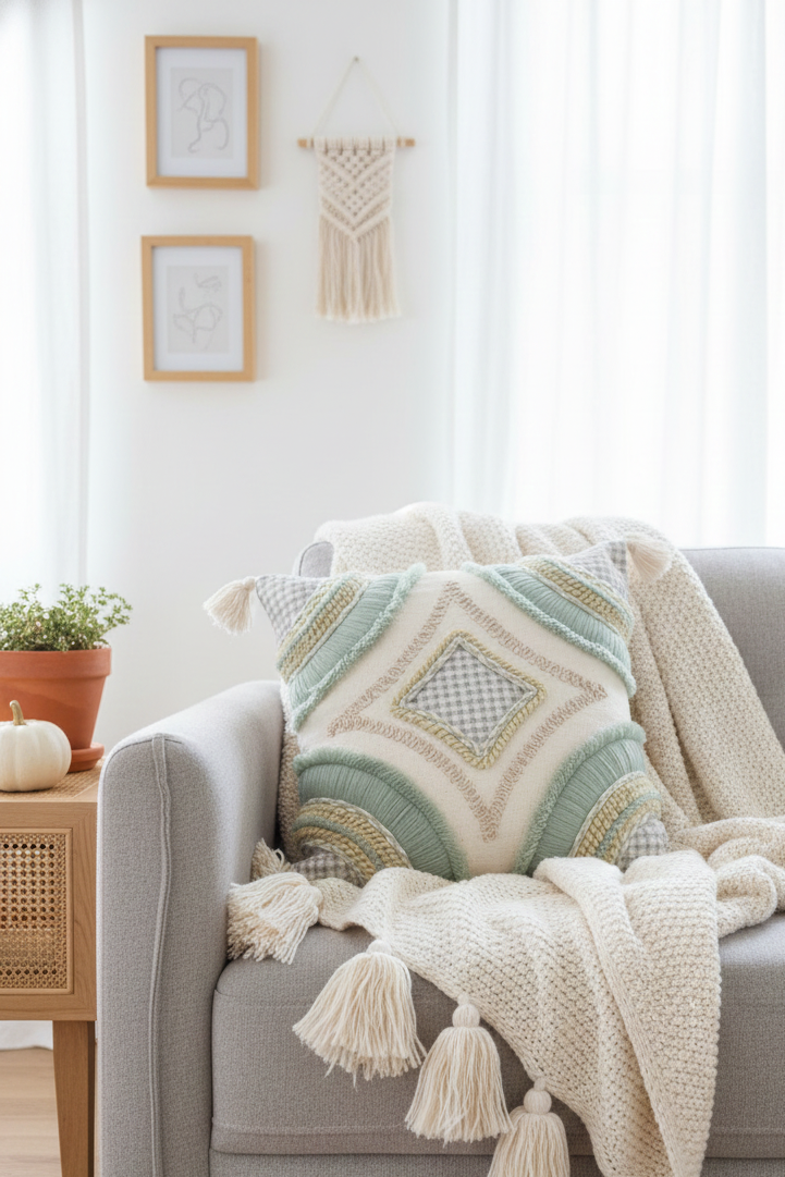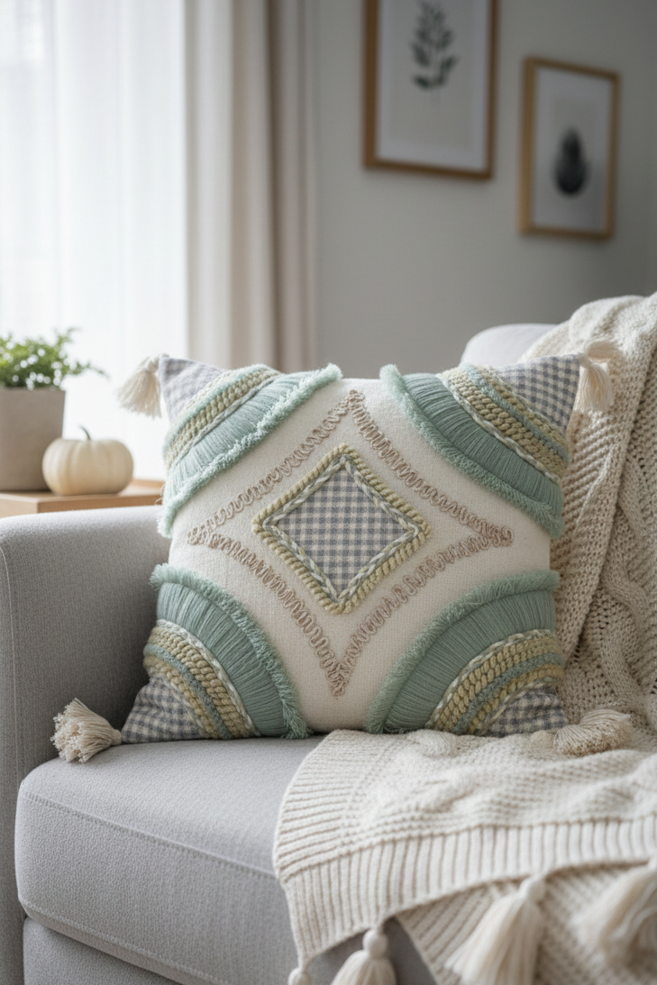 Craftsmanship of the product: The design features intricate check pattern embroidery, with four flap fringes attached to each corner to balance the design and create a fuller effect. To add a touch of elegance, each corner is embellished with twin tassels. The result is a unique and beautiful cushion cover with a personal touch that brings a cozy and stylish feel to any space.