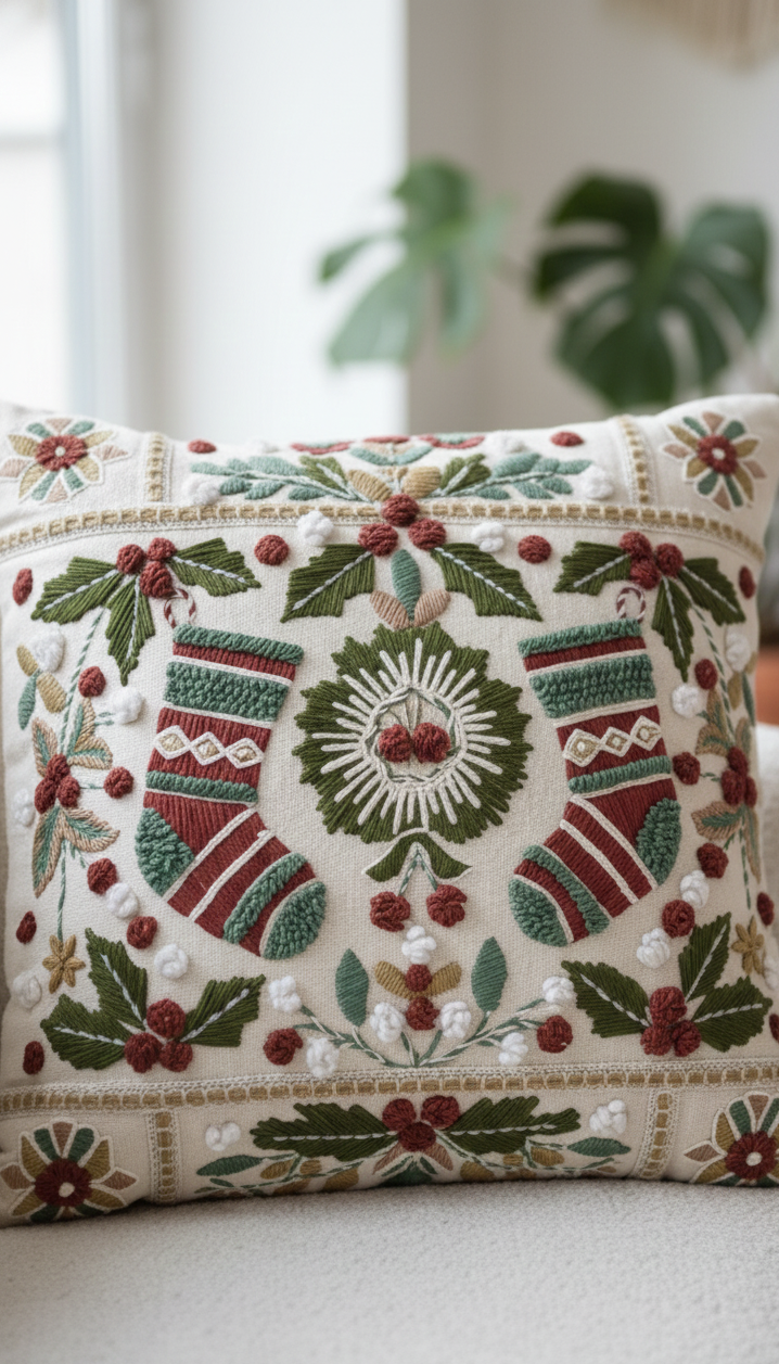 Crafted with precision and love, this cushion is a testament to the artistry of skilled hands. The intricate embroidery showcases a rich palette of festive reds, greens, and golds, blending traditional motifs with a contemporary touch. The use of high-quality materials ensures durability, while the detailed stitching highlights the dedication of artisans in creating this one-of-a-kind piece.