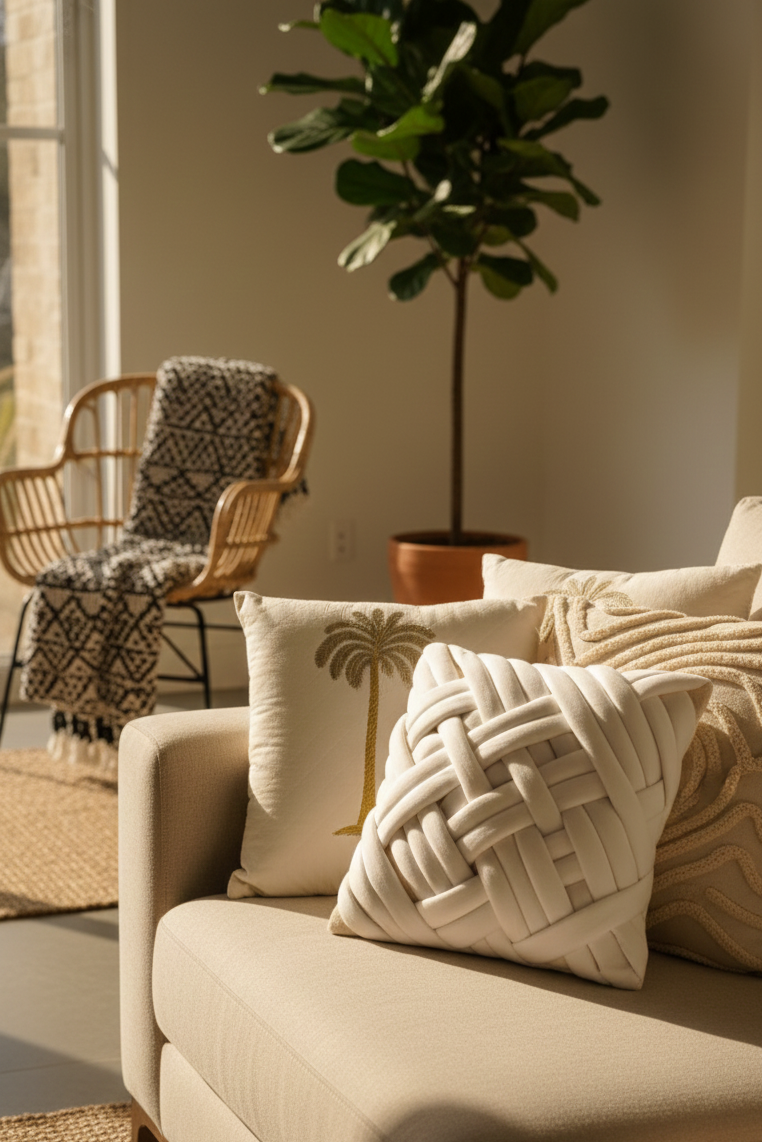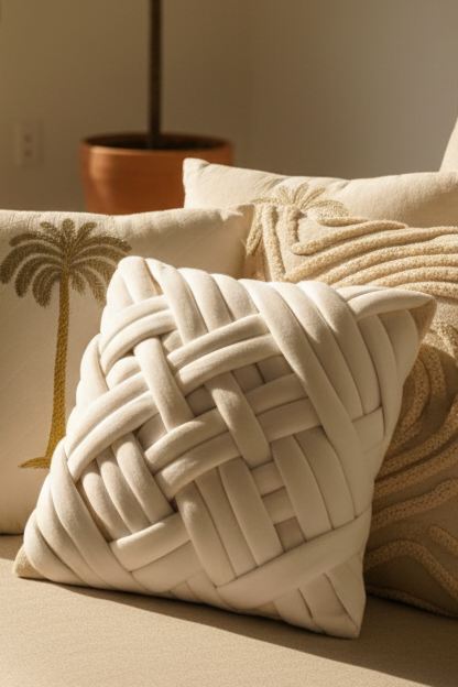 The Cloud Braid Cushion is a striking modern piece that merges plush tactility with sculptural form. Its thick, padded braids are intricately interwoven to create a bold, cloud-like weave that feels both luxurious and comforting. Designed to stand out in neutral or contemporary spaces, this cushion brings an architectural yet soft visual rhythm, turning any sofa or chair into a design statement.