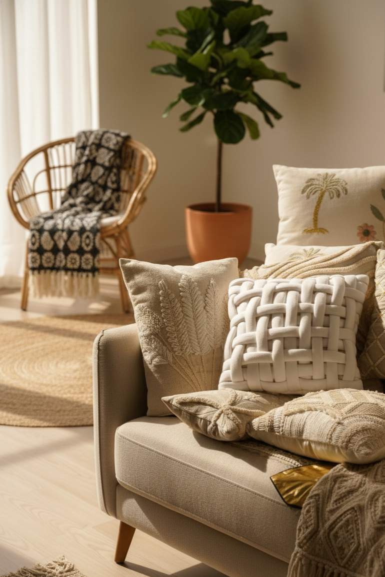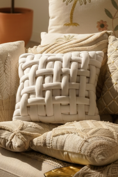 This technique demands immense manual control — any irregularity can disturb the clean geometry. The edges are secured from the inside to maintain a seamless, sculpted finish. The result is a cushion that radiates softness and precision in equal measure, showcasing the beauty of controlled hand-weaving.