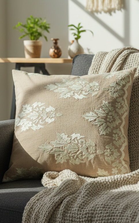 Craftmanship of the Product: Creamy Vines" cushion embodies artisanal elegance with intricate white floral embroidery inspired by graceful vines. Crafted with care, this cushion adds a touch of timeless beauty to any space, blending natural inspiration with sophisticated design for a serene and stylish accent. Perfect for elevating your home decor.