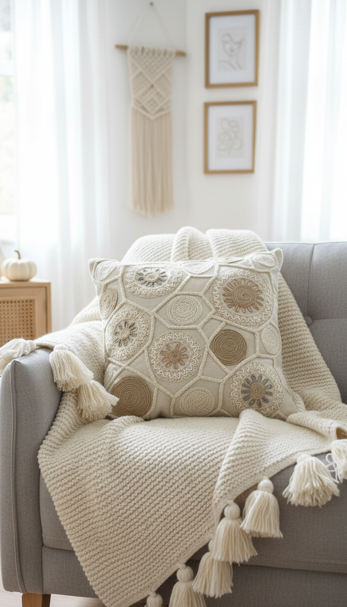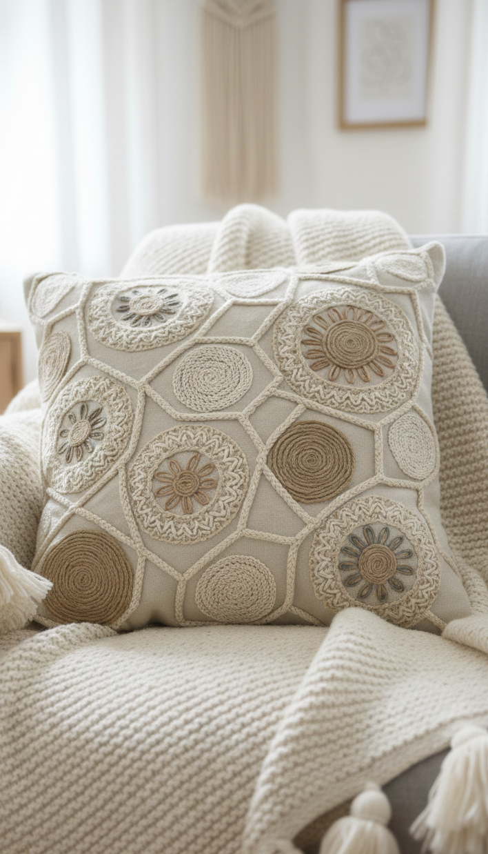 Craftsmanship of the product: This handcrafted cushion cover features a unique windmill-inspired design, with six distinct wing patterns meticulously embroidered to resemble spinning fans. The intricate embroidery is complemented by the addition of jute lace, enhancing the spinning illusion. The use of neutral tones in cotton and jute creates a subtle yet elegant contrast, resulting in a delicately sophisticated appearance that adds charm to any space..