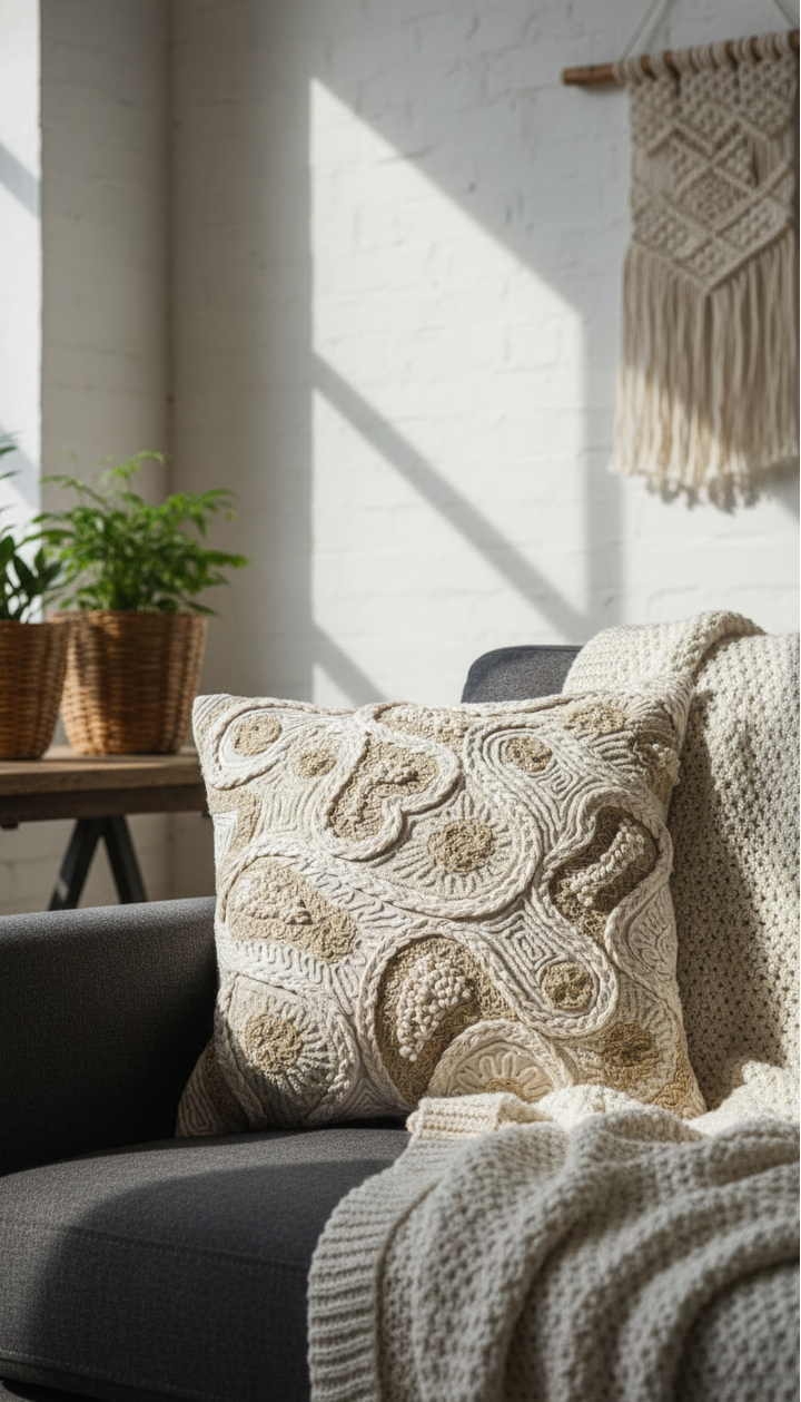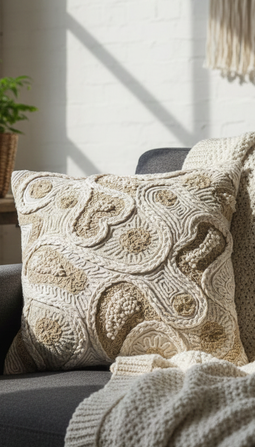 Craftmanship of the Product: "Earthy Labyrinth" cushion draws inspiration from intricate labyrinth patterns, crafted by skilled artisans. Using rich textures and natural tones, this cushion captures the essence of maze-like designs. Perfect for adding a touch of rustic elegance and sophisticated artistry to any living space, it combines beauty with timeless craftsmanship.