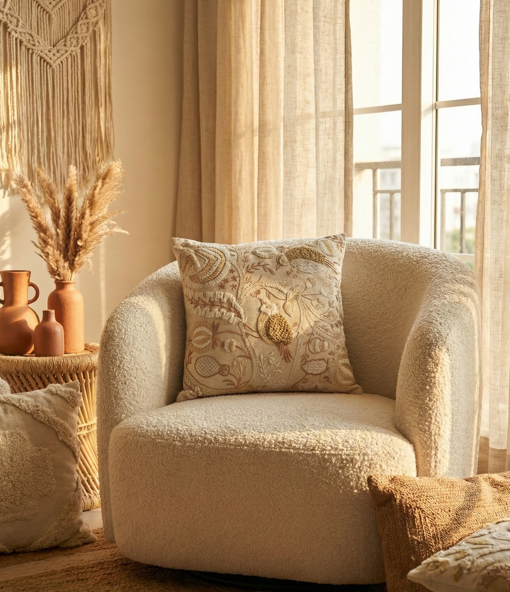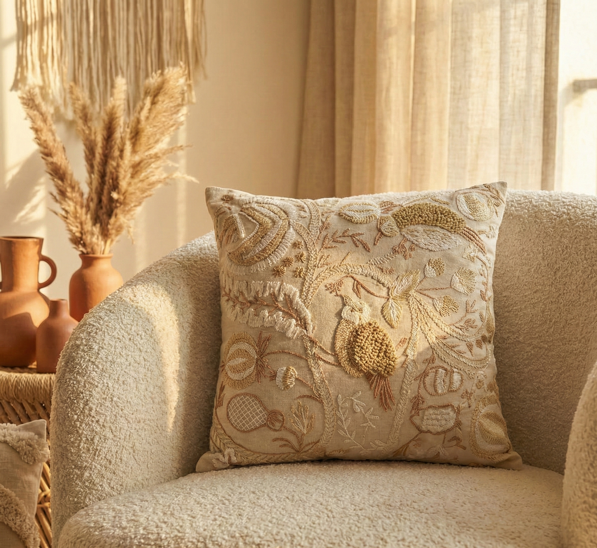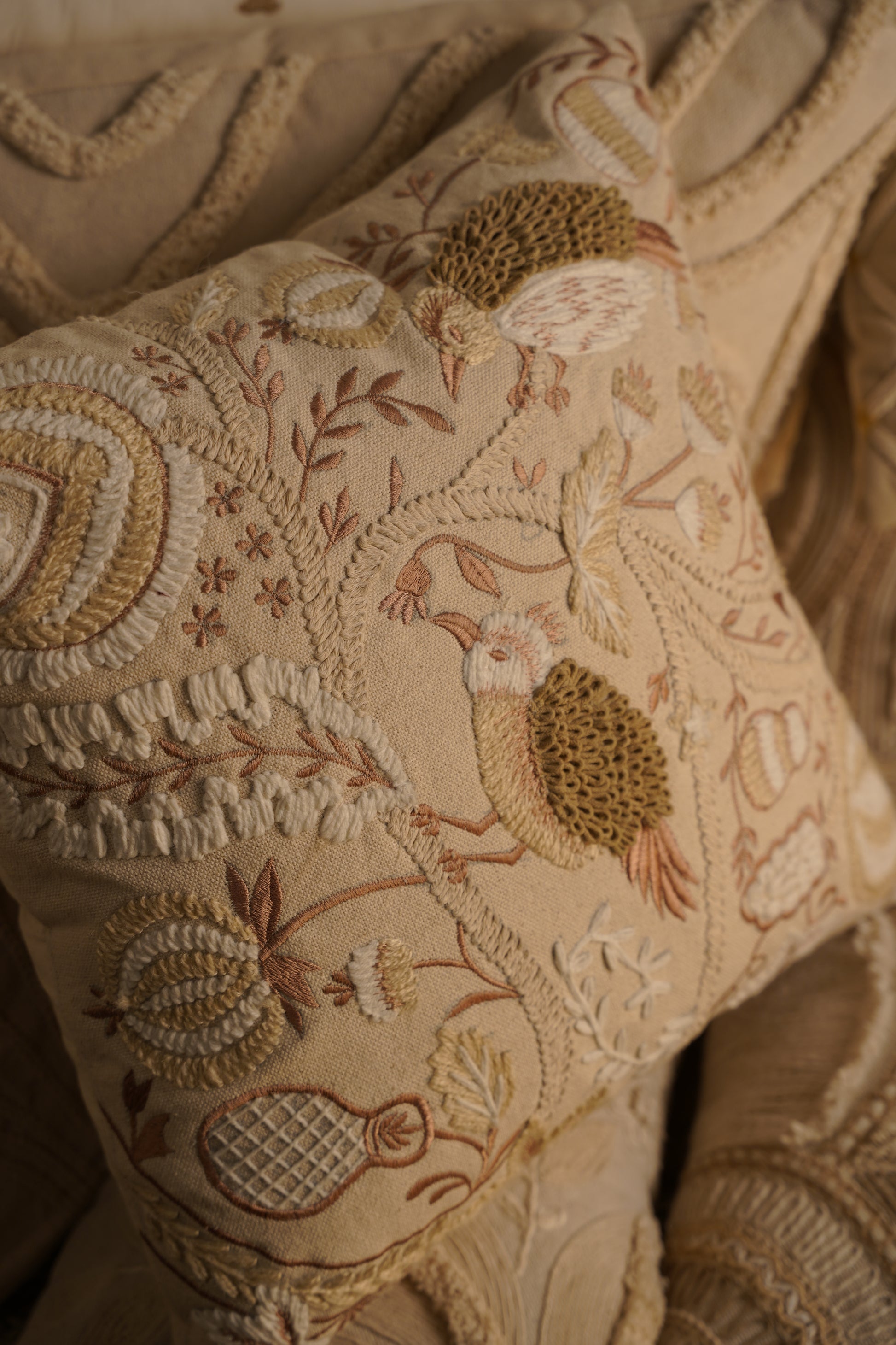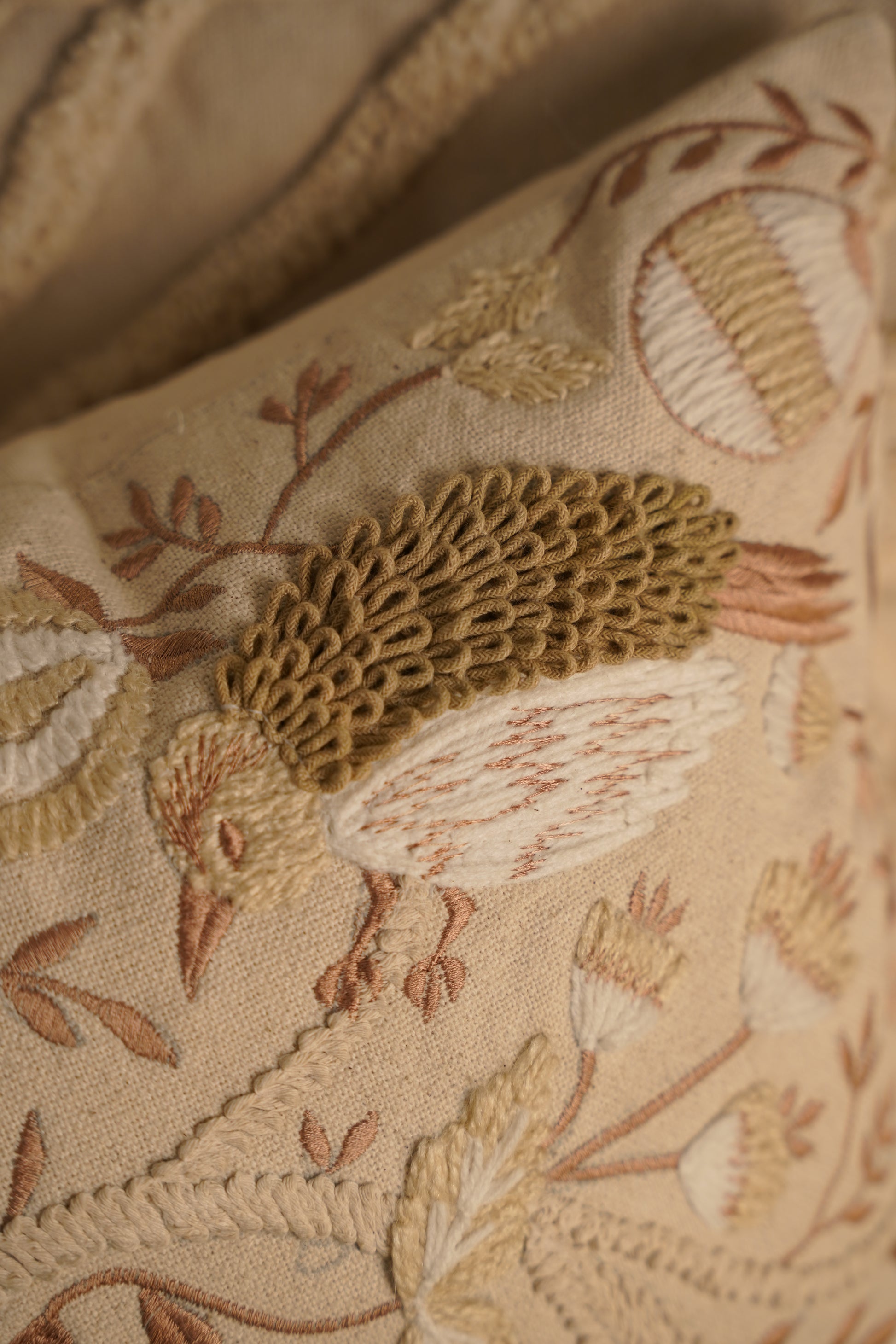 The Sparrow Motif Cushion features delicately embroidered sparrows surrounded by stylized foliage and florals. The composition, rendered in soft earthy tones, blends artisanal craft with timeless charm — making it an elegant statement piece for contemporary or classic interiors.