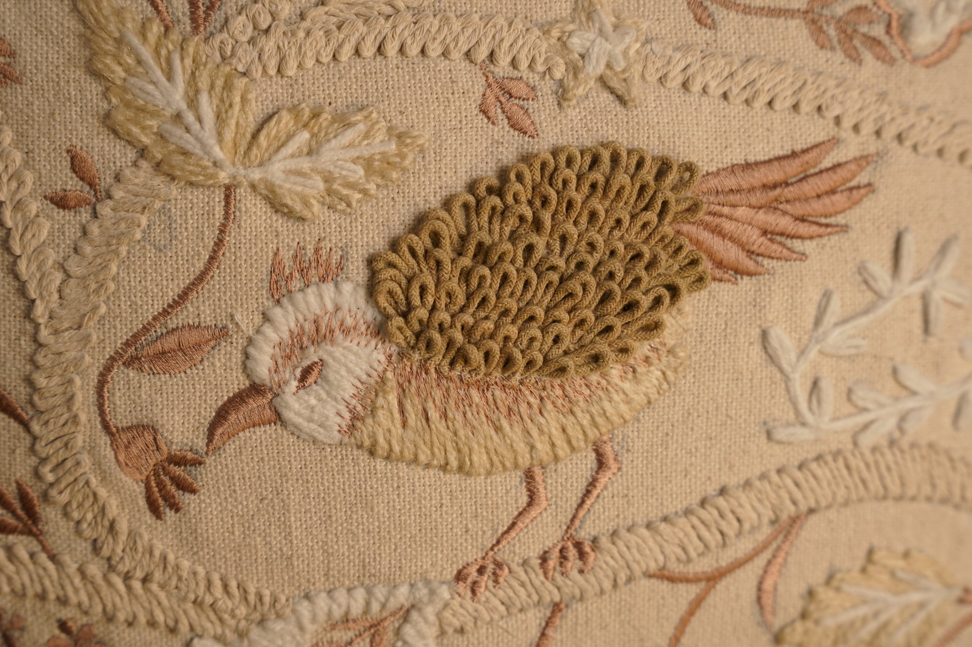 Skilled artisans use a combination of loop stitches, padded threadwork, satin fills, and intricate outlining to bring the sparrows and surrounding motifs to life. Each element is carefully hand-worked on a cotton base, creating depth, texture, and a rich tactile finish. The precise detailing in the feathers and floral elements showcases advanced embroidery skill.