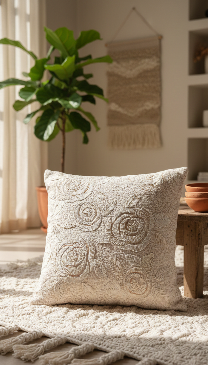 This handcrafted cushion brings the timeless beauty of roses into your home, reflecting the artisans' skill and cultural heritage. Elevate your decor with this elegant, floral masterpiece.