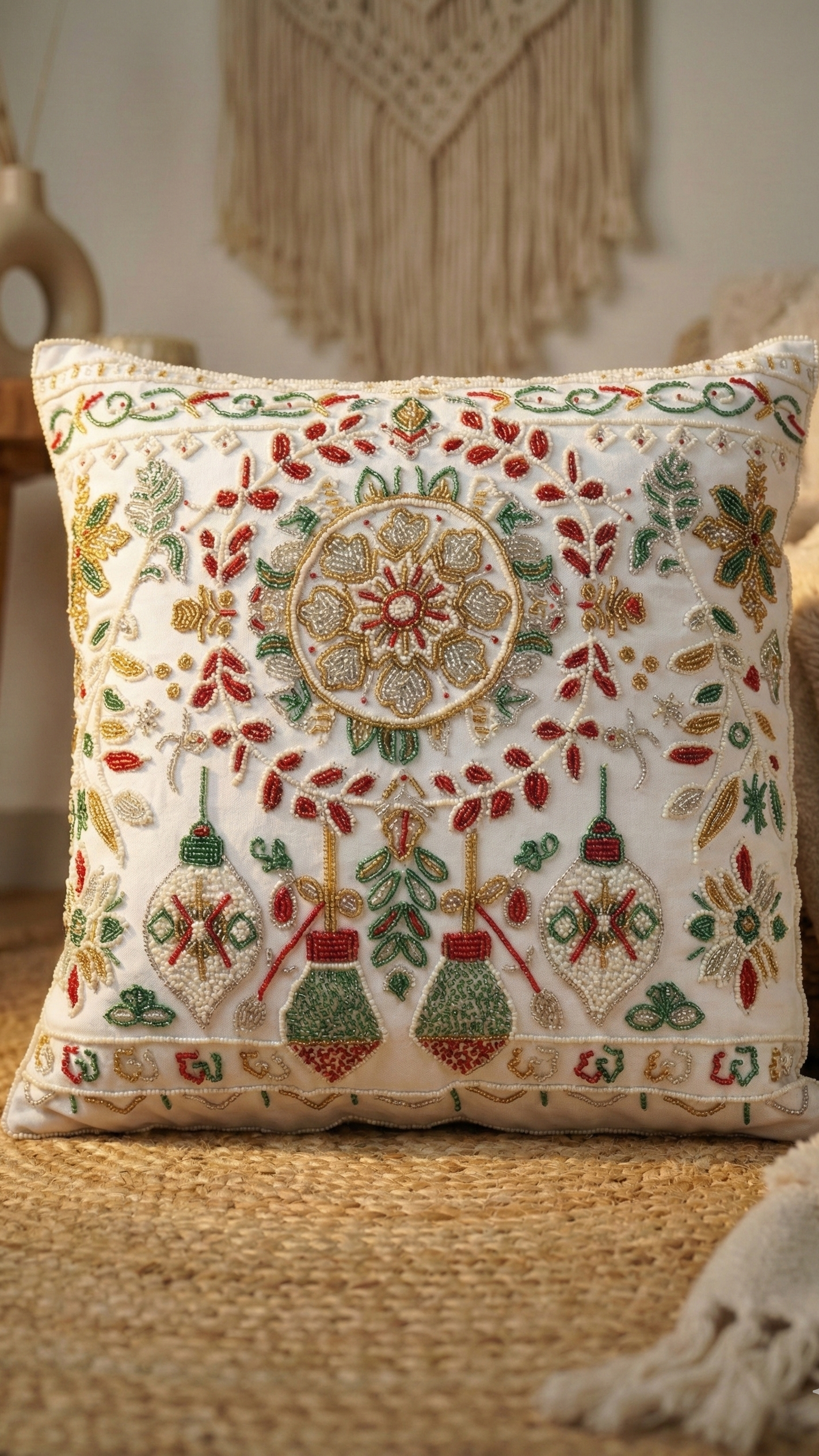 This cushion celebrates the vibrancy of festive traditions and artisanal beauty. Its intricate design, inspired by floral medallions and decorative motifs, evokes a sense of timeless elegance. A perfect blend of heritage and modern aesthetics, this cushion adds warmth and sophistication to any setting.