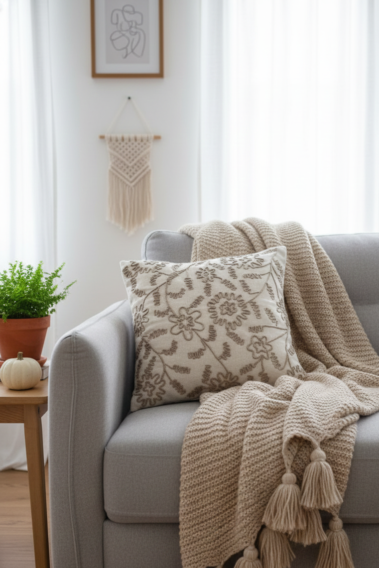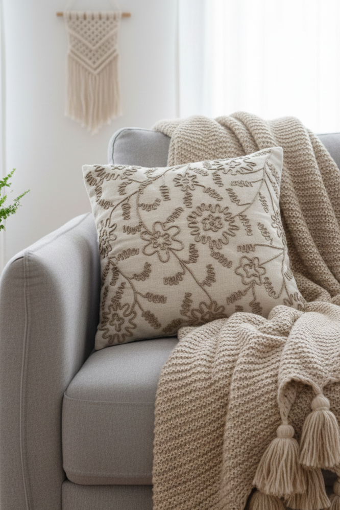 Craftsmanship of the product: This cushion is made by overlaying natural jute fibers on handwoven fabric in intricate floral and leaf patterns. The jute yarn is in corded form, and no additional color is added to the material, giving it a natural, neutral finish that adds to the warmth and intimacy of the environment.