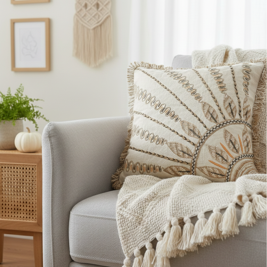 Story of the product: The designer of this stunning cushion cover drew inspiration from the magnificent peacock, with its iridescent feathers and regal presence. Rather than using traditional printing techniques, the designer opted for a loom fabric, which was overlaid with intricate jute laces and delicate chicken embroidery to create a unique and dynamic pattern. The finishing touch of the elegant fringe on all sides completes the design, resulting in a truly special and eye-catching product.