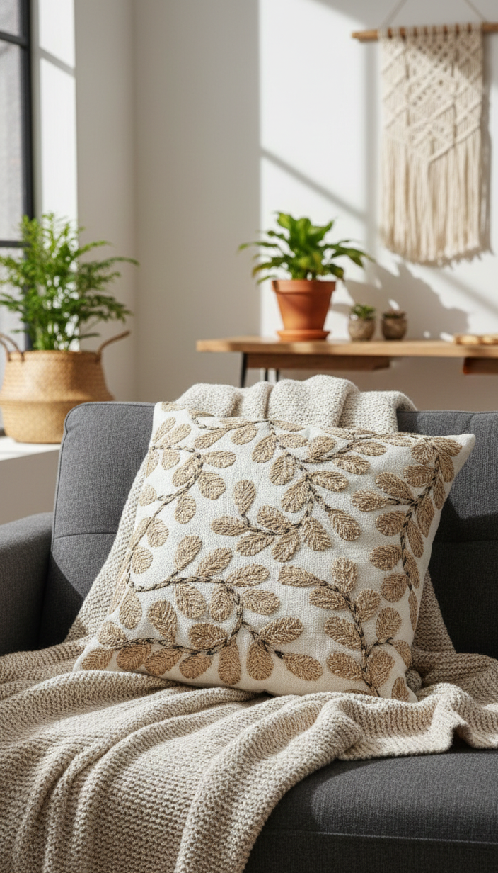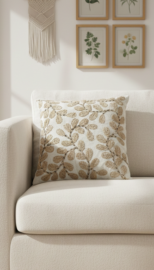 This cushion showcases traditional craftsmanship with its elegant jute leaf embroidery and artisanal design. It blends timeless charm and sophistication, demonstrating careful attention to detail and quality. Every part of the cushion is crafted to highlight the skill and beauty involved, making it a graceful and stylish piece.