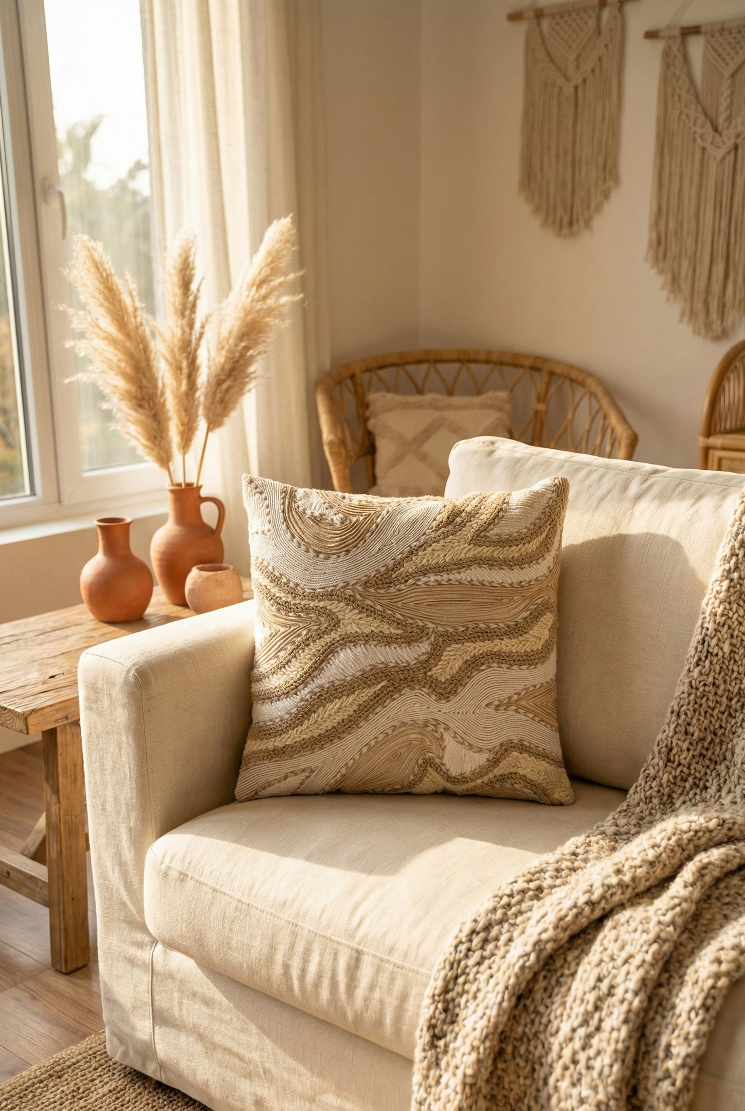 This cushion is crafted using meticulous corded embroidery and padded appliqué techniques. Artisans layer cords and textured threads in undulating lines, forming raised ridges that mimic natural wave patterns. The precise alignment of each cord ensures smooth, flowing contours without breaks.
