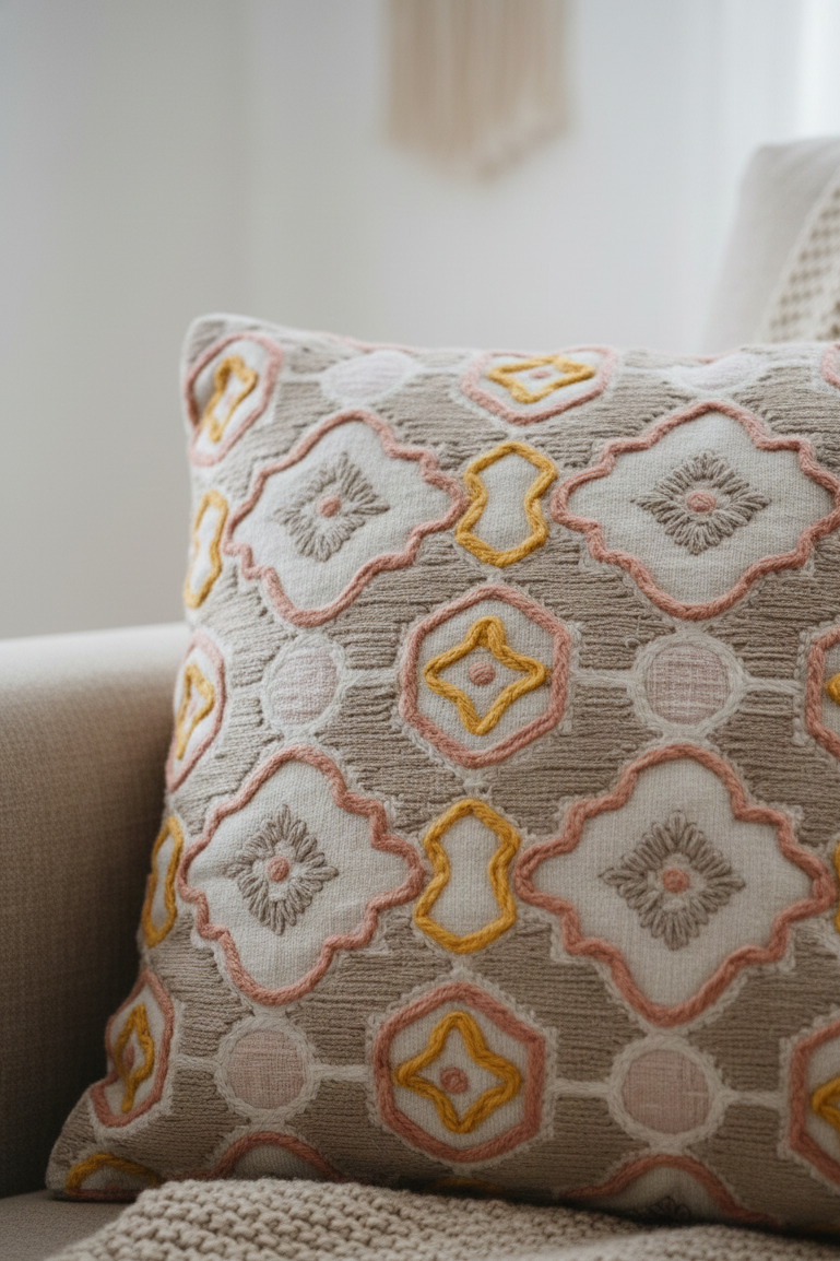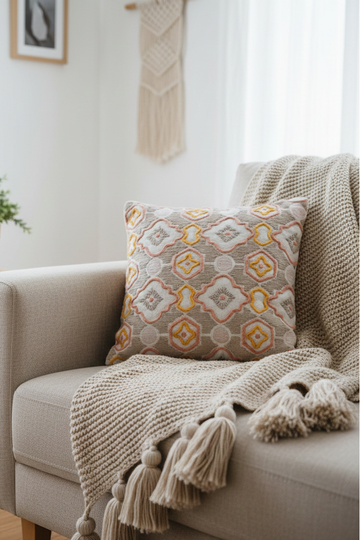 Story of the product: Drawing inspiration from the intricate tiles adorning Marrakesh's buildings, this cushion cover features an abstract interpretation of the design. Its color scheme of blush and yellow captures the warmth of the Marrakesh sunset, and its bold shapes and delicate lines create a unique aesthetic. The result is a beautiful and cultural piece that adds elegance to any home.