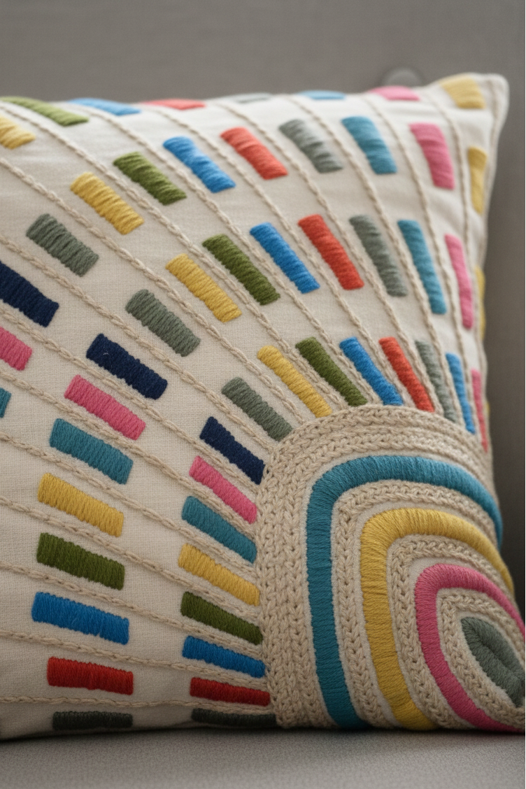 Craftsmanship of the product: This handcrafted cushion cover features intricate hand embroidery, including a corner embellished with a peacock feather and a patterned capsule of colorful stripes. The cover also boasts lace embroidery and hand-stitching throughout, as well as patterned outlines made of natural fibers, which are skillfully embroidered onto loom fabric. The result is a stunning and unique cushion cover that is sure to add beauty and character to any home.