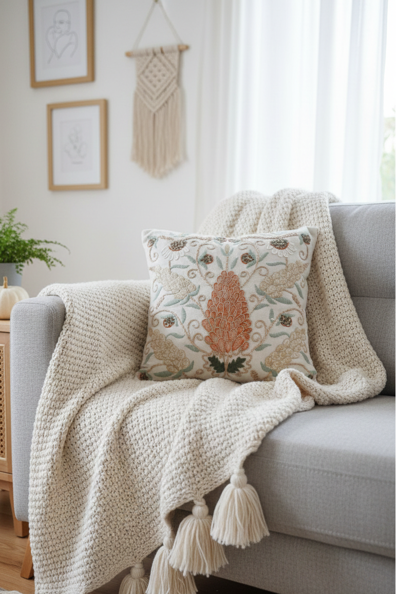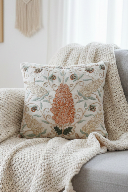 Craftsmanship of the product: These hand-made cushion covers features intricate embellishments created through a combination of needle-looping and hand-embroidery techniques. The design incorporates a floral motifs and leaves with careful designing and hand stitching the embellishment on the fabric.