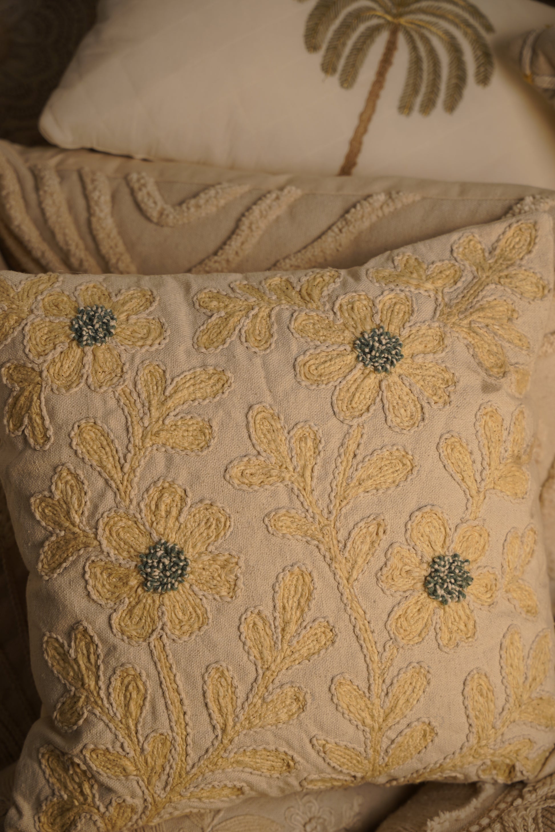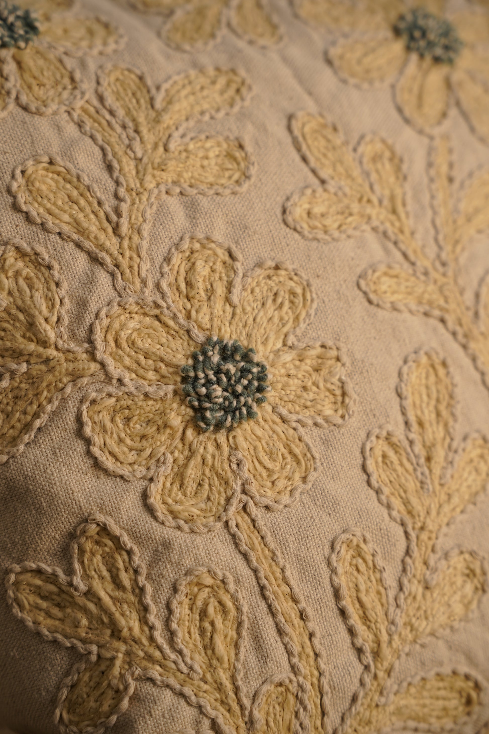 This cushion features hand looping embroidery along chain stitch, outline stitch, and dense knotwork to bring the daisy motifs to life. The raised vine lines are created through looped and textured embroidery, while each flower centre is hand-knotted in contrasting tones for dimension. Set against a neutral cotton base, the result is a soft, tactile floral story that feels both handcrafted and elevated.