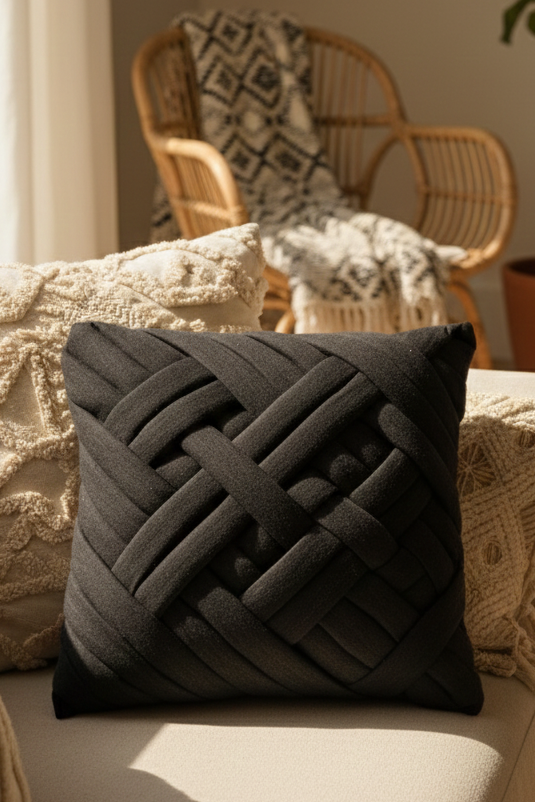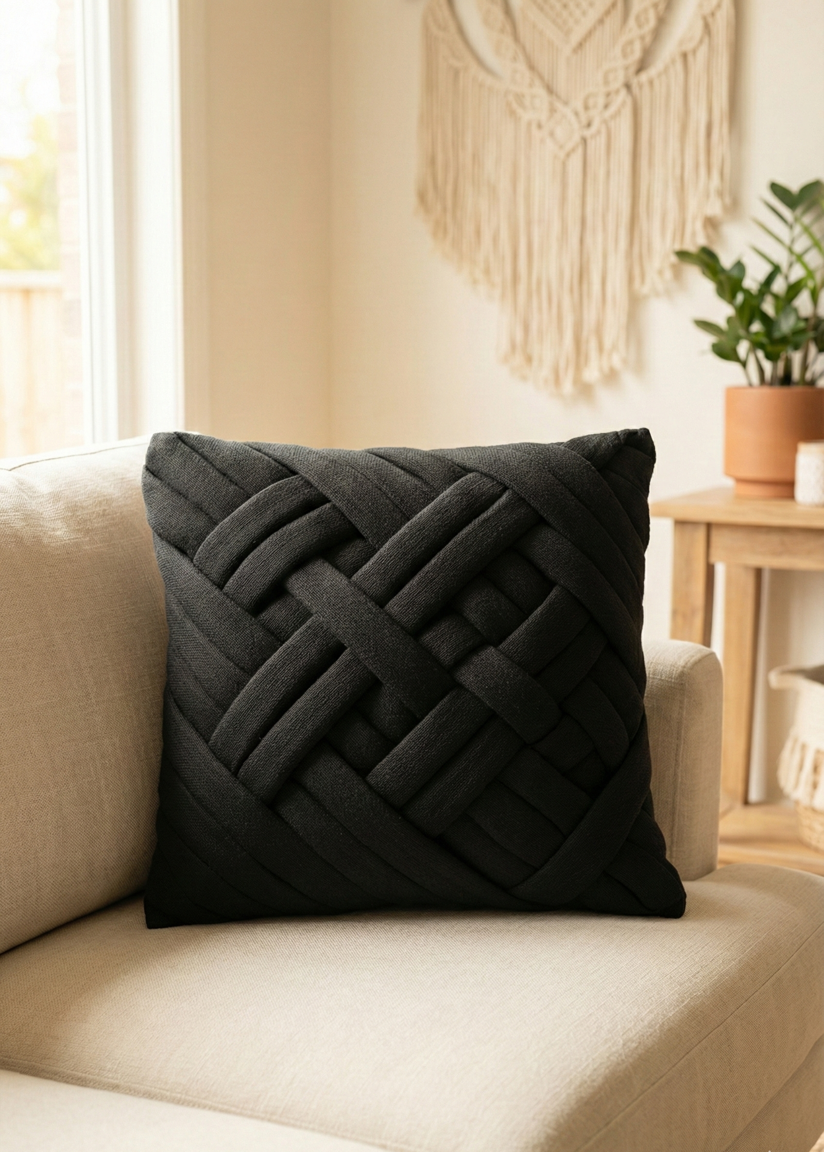 Midnight Weave cushion cover draws its intrigue from its striking all–black palette and bold lattice structure. Inspired by traditional weaving methods, this piece transforms basic cotton fabric strips into a sophisticated grid , each strap meticulously hand-pulled and layered by skilled artisans. The result is a cushion that feels both architectural and textural, almost like a sculptural element resting on your sofa.