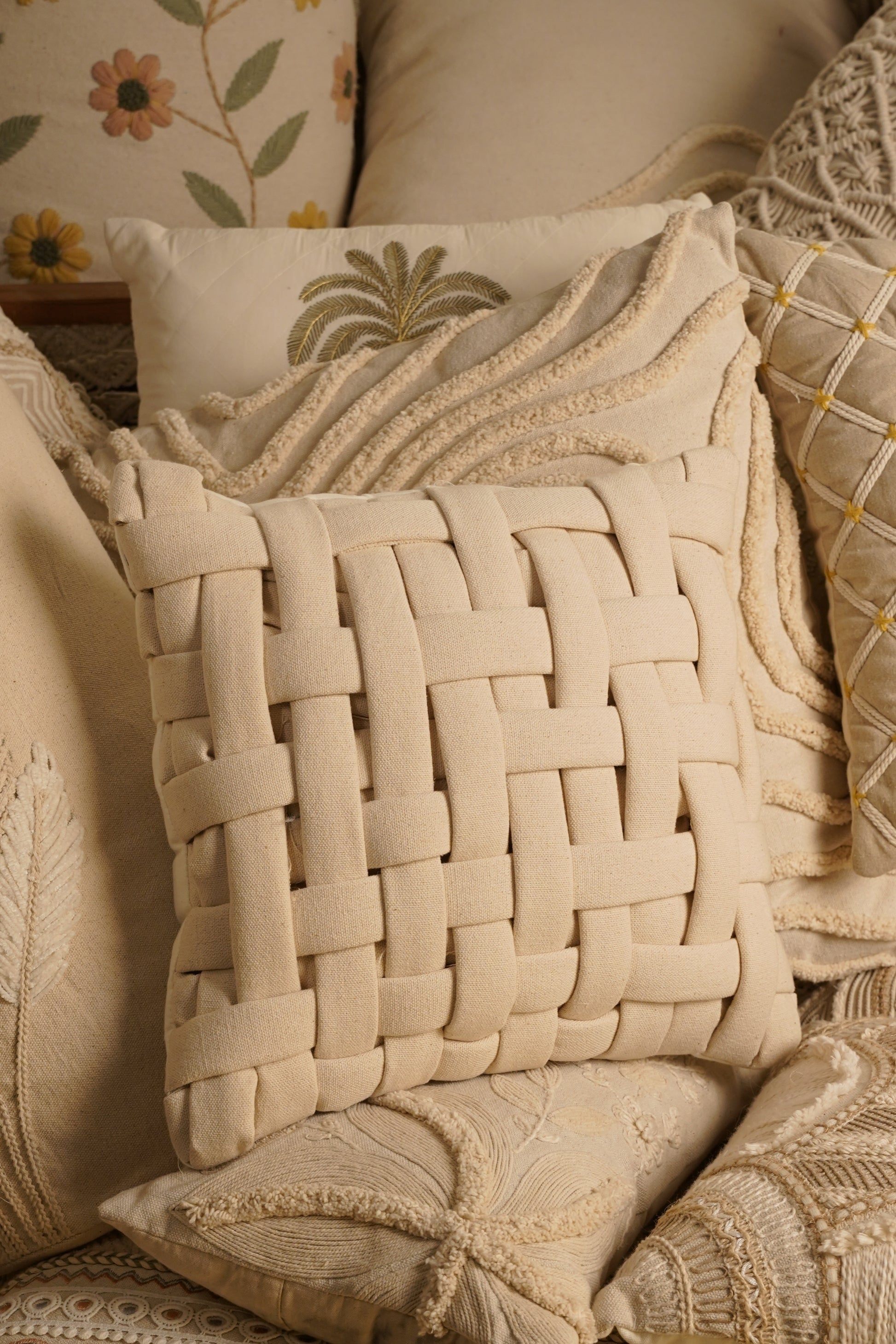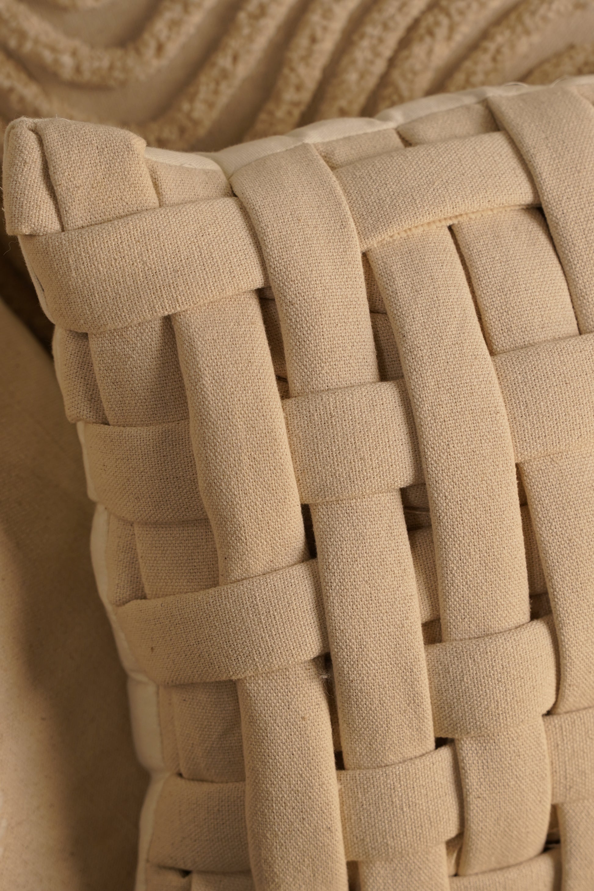 Each cushion is handwoven using thick cotton fabric strips, carefully interlaced in a criss-cross basket weave pattern. Achieving this precise interlocking structure requires manual alignment and tension control to keep the weave uniform across the surface.The strips are secured and finished along the edges to ensure a clean, tailored look. Unlike machine-woven patterns, this technique uses individually cut and folded strips, giving the cushion dimensional structure and handcrafted integrity. The result is a cushion that balances soft tactile feel with geometric order, highlighting the artistry of handweaving in a modern format.