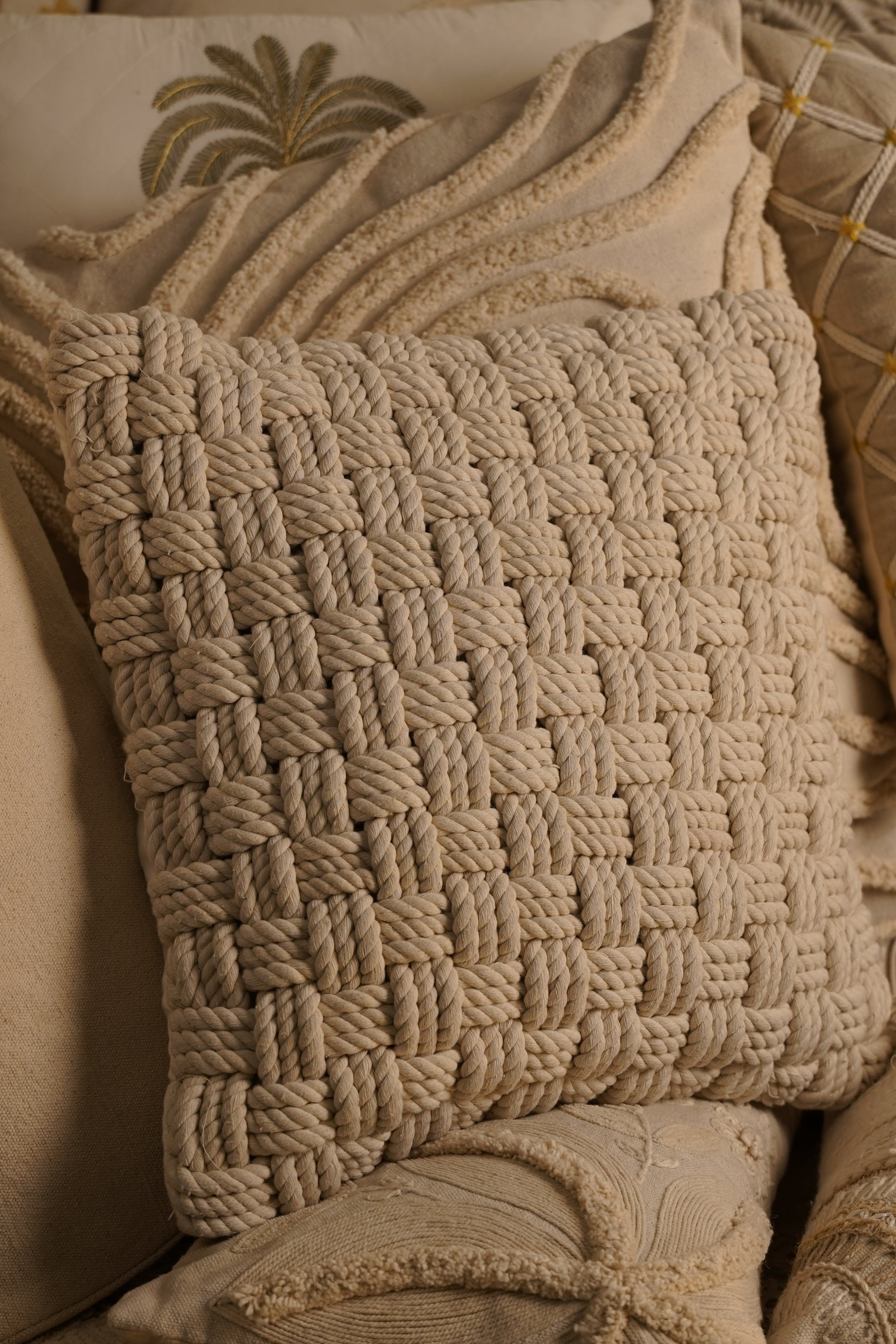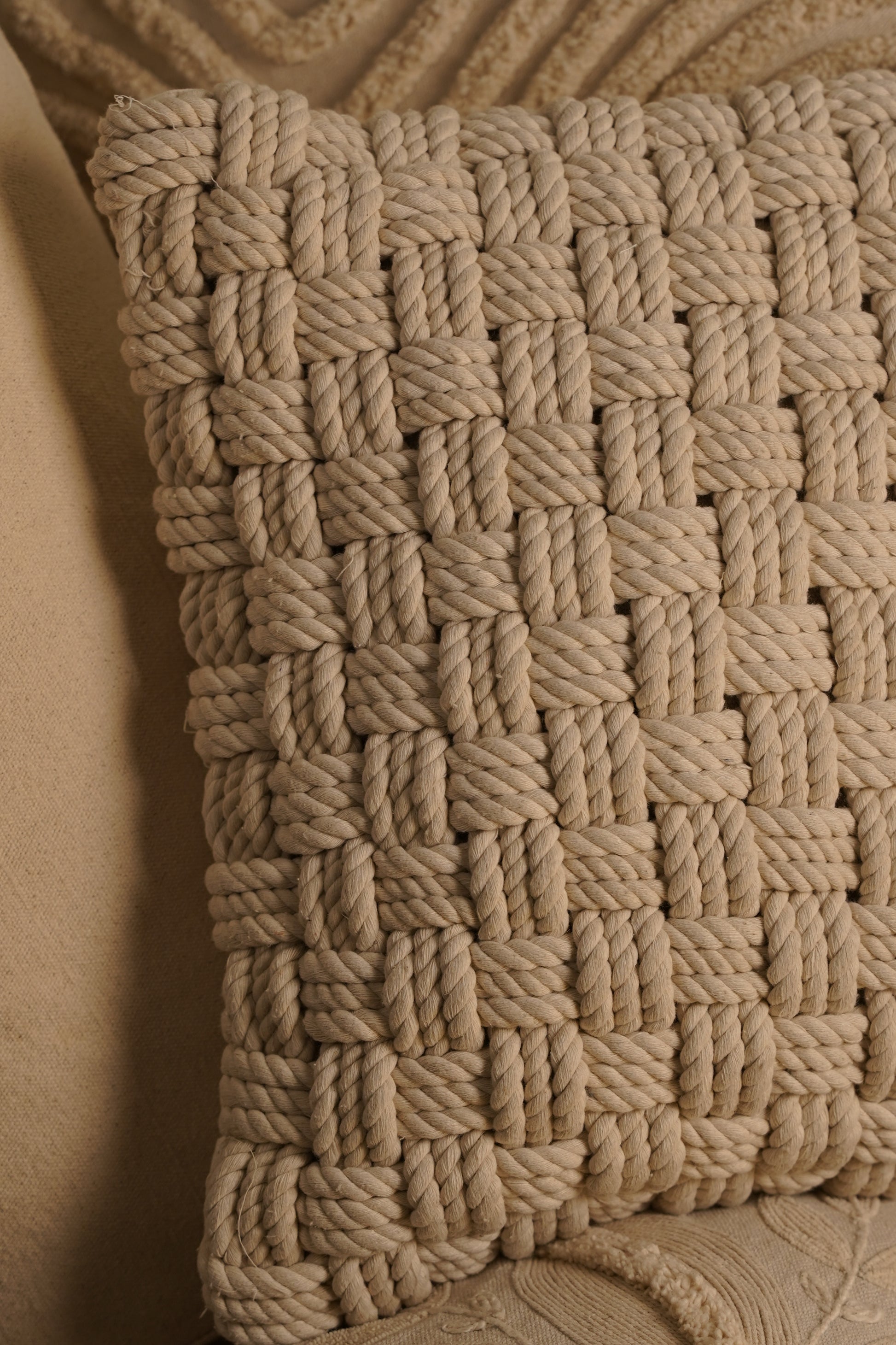 The ropes are secured at the edges with hidden stitching for a clean finish. The resulting texture is dense yet flexible, giving the cushion a sculptural look while remaining soft to touch. This handcrafted weaving method showcases traditional macramé skills adapted into a modern, structured format, making each piece unique