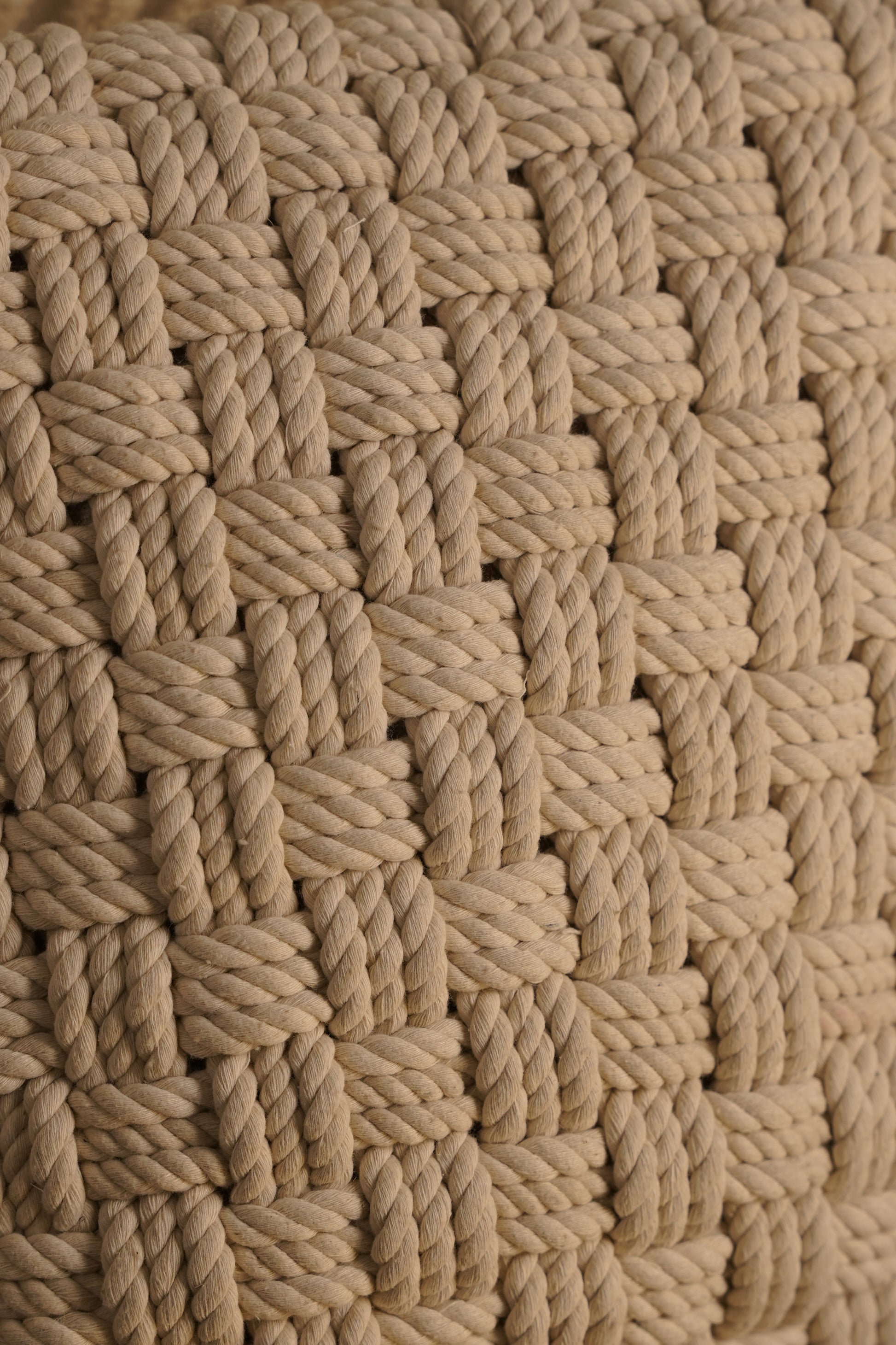 Each cushion is hand-woven by skilled artisans, who carefully interlace thick cotton ropes into a tight basket-weave structure. This process requires precision to maintain even spacing and consistent tension across the entire surface, ensuring both durability and a uniform pattern.