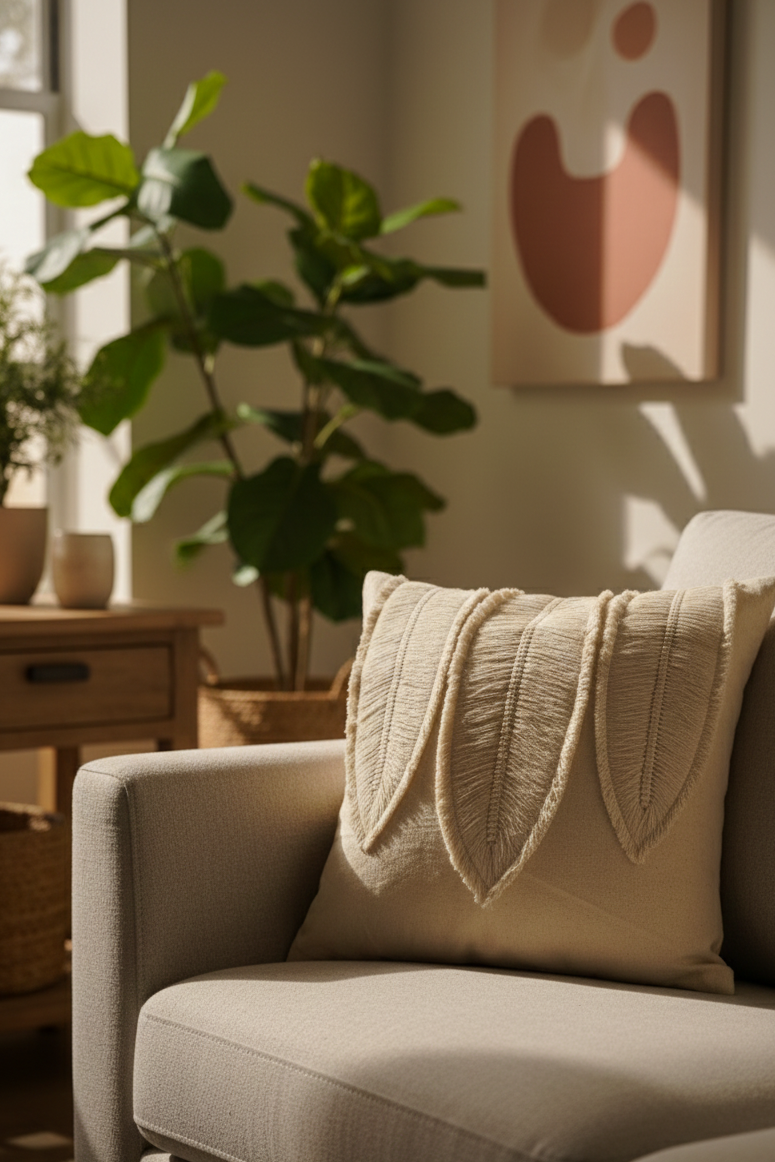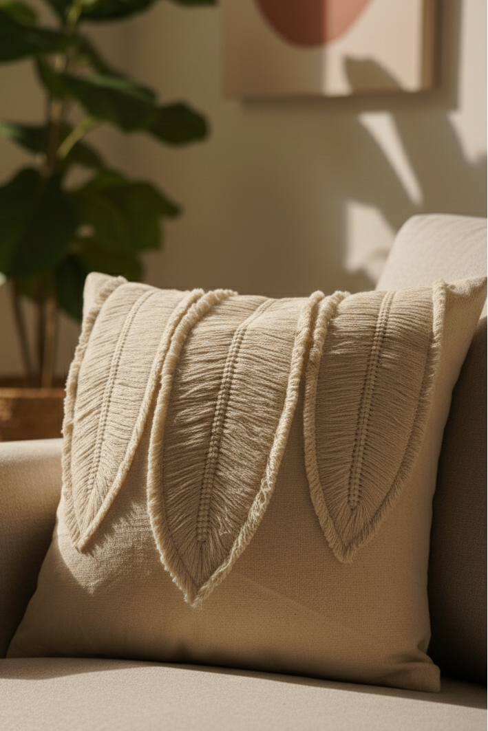 The Pankh Cushion draws inspiration from the quiet elegance of nature’s feathers and leaves. Its layered, fringed panels create a graceful, flowing texture that brings organic movement into interiors. Designed in soft neutral tones, it’s a subtle statement piece that adds depth and artisanal character to modern spaces without overpowering them.