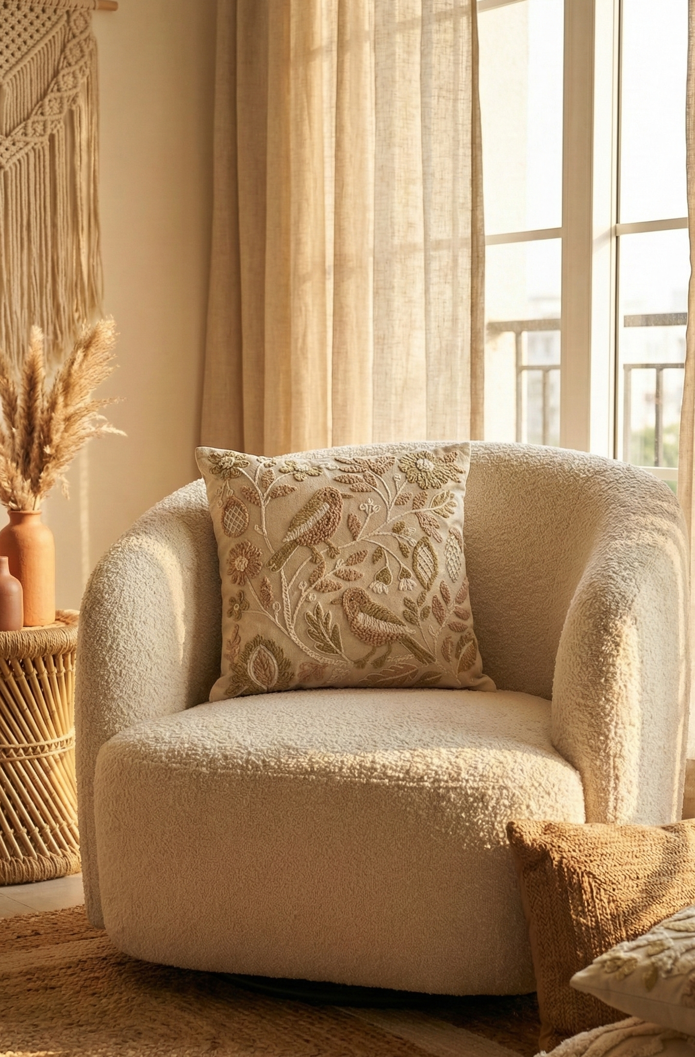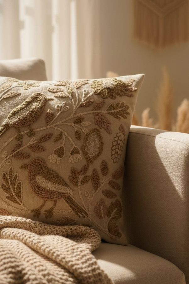 The Twin Birds Cushion highlights two delicately embroidered birds perched amidst soft floral and leaf motifs. The design celebrates the harmony of nature through artisanal craftsmanship, expressed in warm beige and olive tones. It’s a statement piece that adds character and textural richness to any interior.