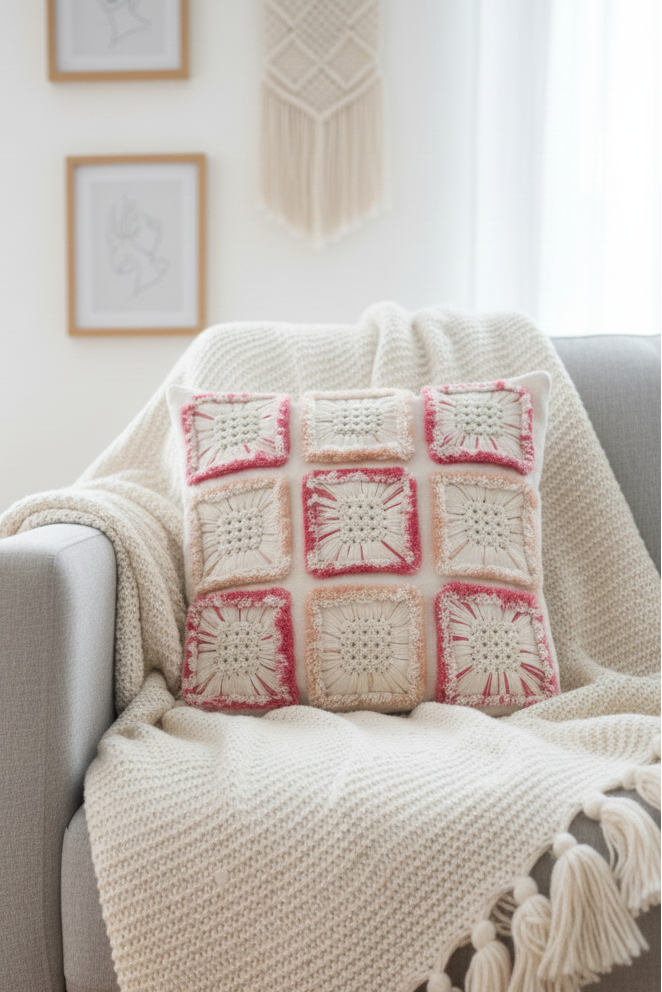 Craftsmanship of the product: This hand-made cushion cover features a tightly knit macrame knot as its central motif, which defines the overall design of the cushion. The centerpiece is a 10x10cm patch of a macrame placemat, which has been incorporated as a 3D patch. The cushion design follows a concentric pattern of squares, using parallel geometrical shapes to create an intricate and visually appealing pattern. The use of high-quality materials and expert craftsmanship ensures that this cushion cover is both durable and beautiful.