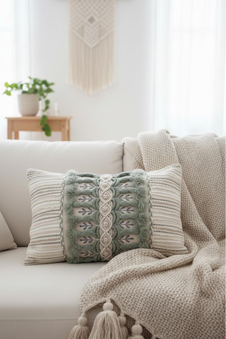 .Craftsmanship of the product: The hand-made cushion cover features a central motif of a heavy chunky macrame with 3D looped tassels. The base fabric is embellished with thread embroidery, while the sides feature stripes of yarn attachment, kantha stitches, and an outline of multi colour hand-beads. Overall, this cushion cover showcases intricate hand-crafted details and a vibrant mix of textures and colors.