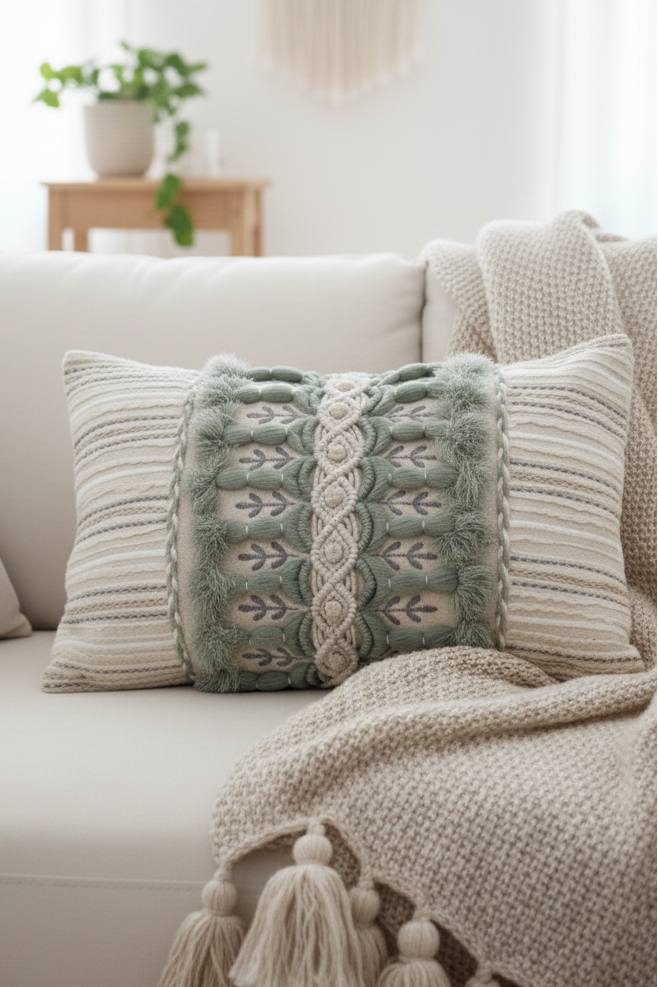 Story of the product: This hand-made cushion cover is a true embodiment of artistic inspiration. The cushion was inspired by the intricate details of chunky macrame knots and the texture of 3D looped tassels. They incorporated these elements into the central motif of the cushion cover, which was further embellished with thread embroidery. The sides were adorned with stripes of yarn attachment, kantha stitches, and hand-beaded outlines in a rainbow of colours, resulting in a one-of-a-kind piece that exudes creativity and craftsmanship