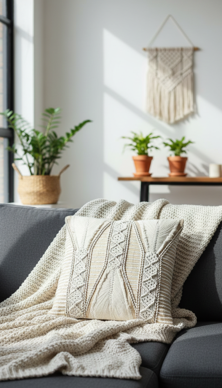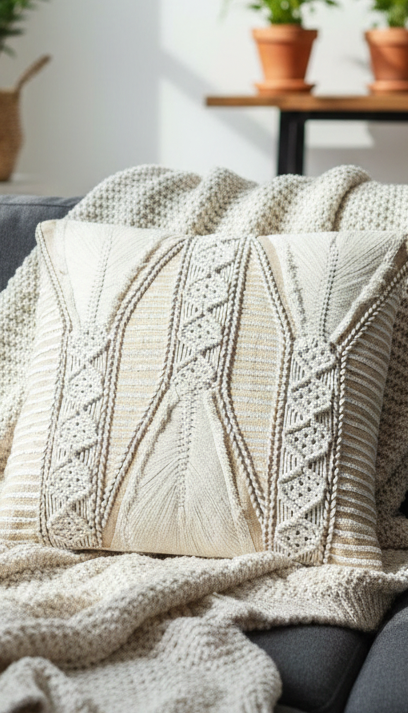 The cushion features a refined design with intricate macrame work, adding a distinctive texture and visual appeal. The base fabric, a soft and breathable handloom cotton, ensures both comfort and durability. This combination of high-quality materials, along with the detailed macrame, reflects exceptional craftsmanship and a commitment to artisanal excellence. The premium design is a testament to the skill involved, making it a standout piece in any decor.