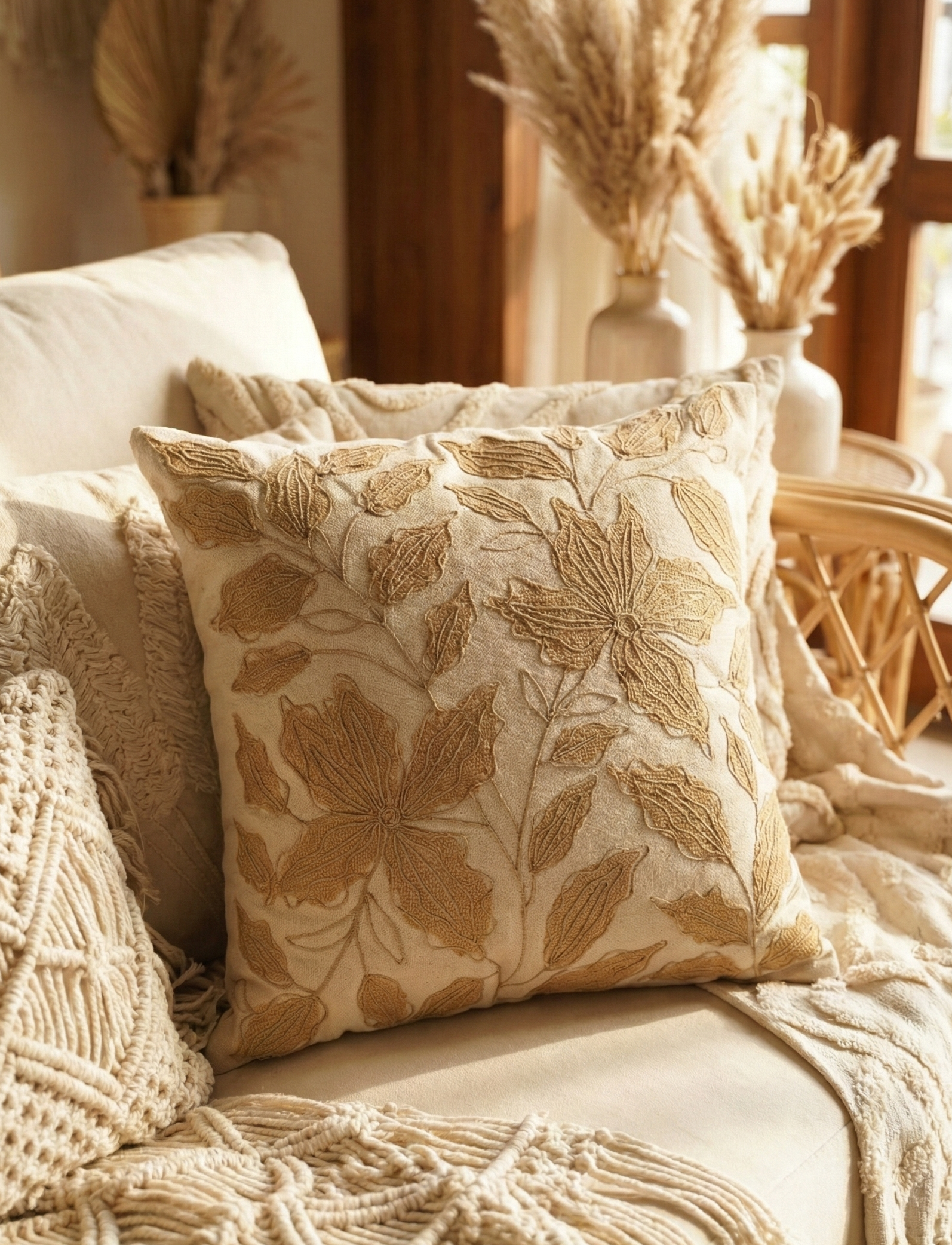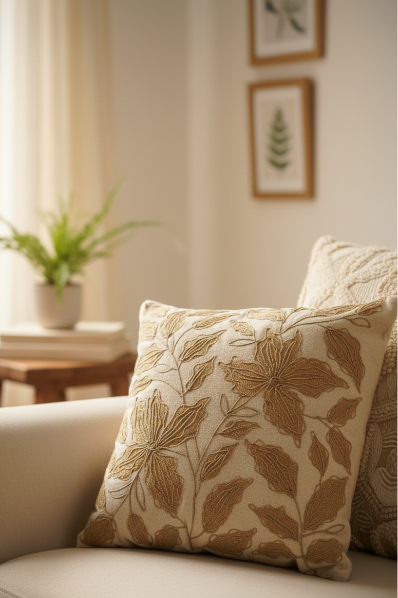 The Golden Bloom Cushion brings to life the beauty of autumnal florals through delicate line embroidery and earthy tones. Inspired by hand-drawn botanical sketches, its warm beige-gold palette exudes quiet sophistication, making it perfect for layering in contemporary, classic, or boho interiors. This cushion elevates neutral spaces with its subtle elegance and timeless floral charm.