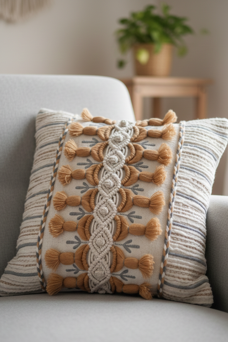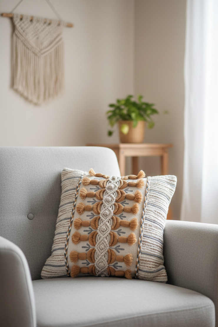 Craftsmanship of the product: The hand-made cushion cover features a central motif of a heavy chunky macrame with 3D looped tassels. The base fabric is embellished with thread embroidery, while the sides feature stripes of yarn attachment, kantha stitches, and an outline of multi colour hand-beads. Overall, this cushion cover showcases intricate hand-crafted details and a vibrant mix of textures and colors.