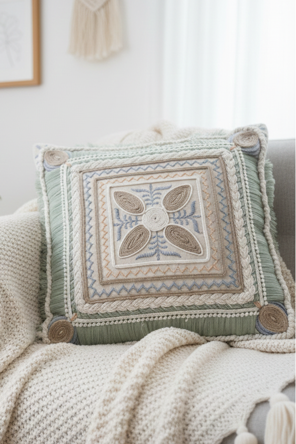 Story of the product: As I looked out at the lush greenery of my traditional Indian heritage home's backyard, I was struck by the beauty of the square patterns formed by the interplay of the leaves and branches. This inspired me to create a cushion cover that featured intricate designs created through various techniques such as embroidery, embellishment, hand-braids, macramé, and hand-loops. To add an extra touch of texture and depth, I decided to incorporate 3D flap fringe borders into the design.