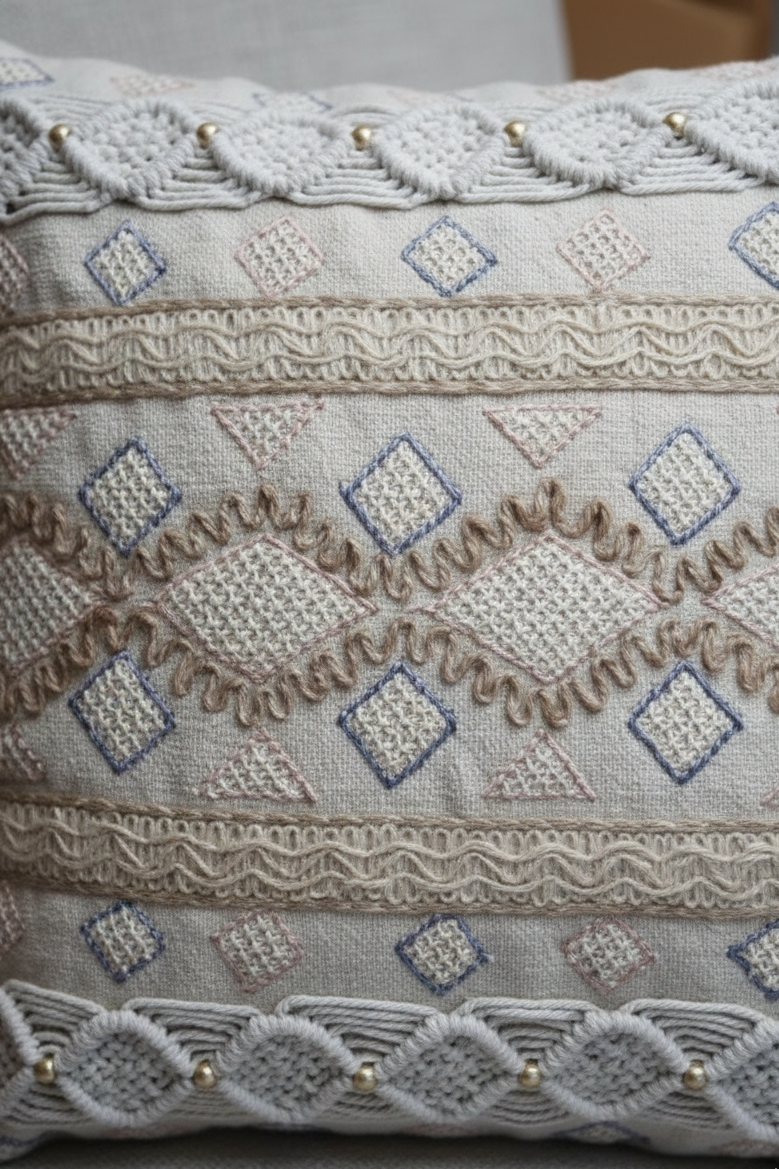 Craftsmanship of the product: This handmade cushion cover features sixty hand-cut pieces of cotton netting, adorned with blue-colored embroidery. The base cushion is further enhanced with two hand-knotted macramé belts, embellished with gold beads. To achieve a balanced look, the base fabric is overlaid with various lace and yarn attachments, resulting in an exquisite design with a touch of sophistication.