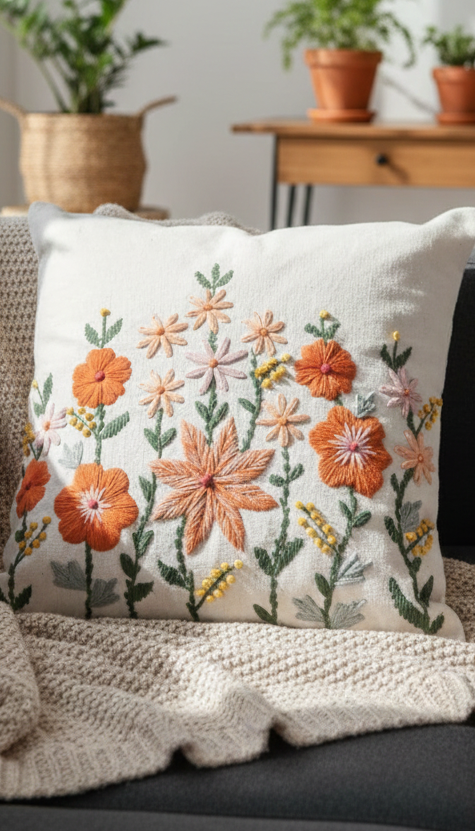 Craftsmanship of the Product: The cushion features a stunning floral design intricately hand-embroidered on premium handloom cotton fabric. The detailed embroidery showcases the fine artistry involved, with each flower carefully crafted to highlight its natural beauty. The base fabric is a luxurious handloom cotton, ensuring a soft and breathable feel. This cushion is a testament to exquisite craftsmanship, blending detailed handwork with high-quality materials.