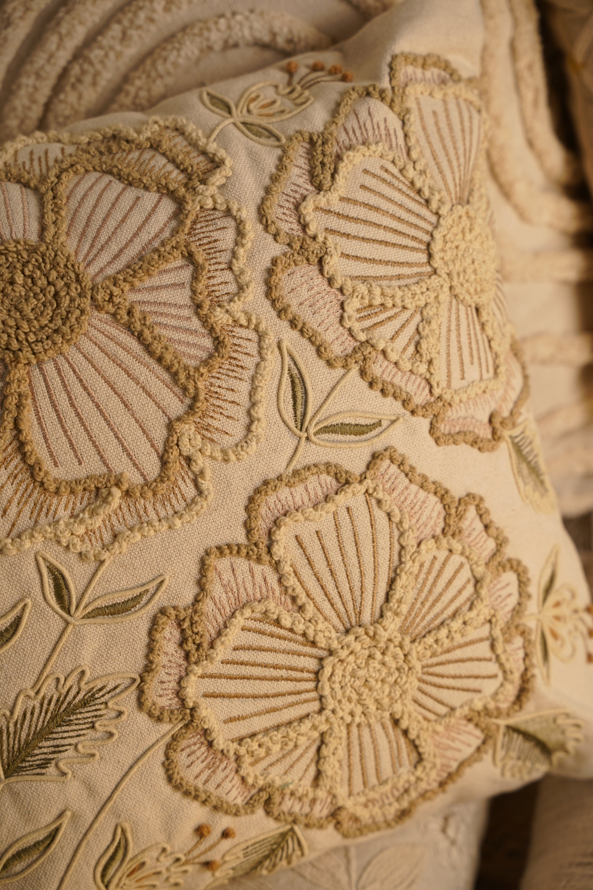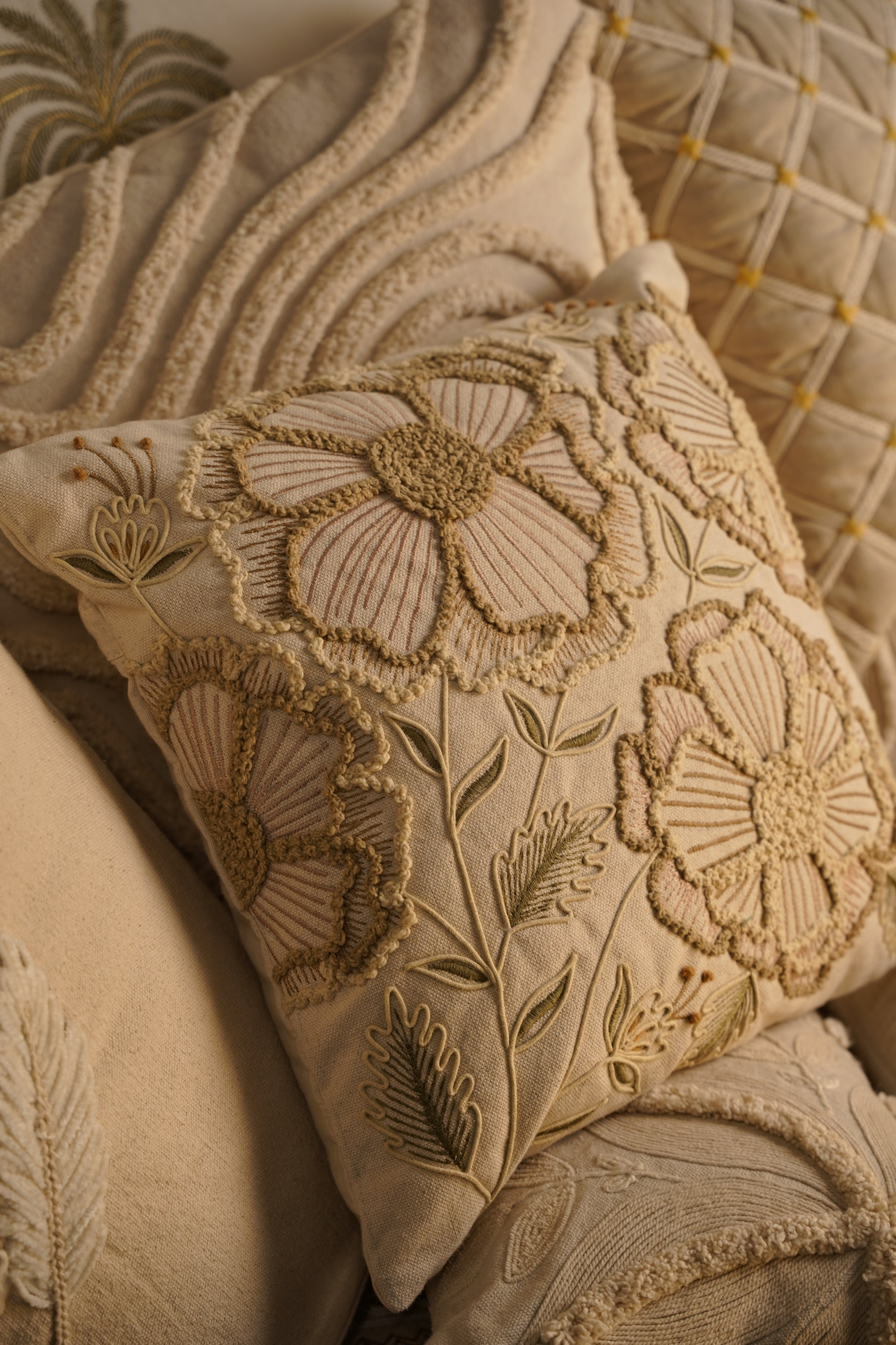 The Sandwave Cushion draws inspiration from the gentle undulations of sand dunes and flowing landscapes. Its surface is sculpted through rhythmic, layered embroidery that creates a dynamic wave-like texture. The soft neutral tones enhance the play of light and shadow, making this cushion a timeless statement piece that blends natural inspiration with meticulous handcrafting.
