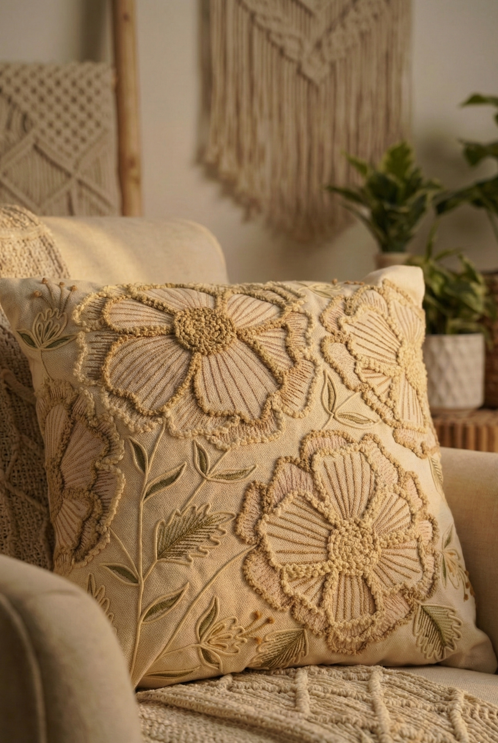 Artisans meticulously build this cushion’s pattern through multi-layered cord embroidery, working wave after wave to create sculpted ridges. Each line is manually guided and hand-stitched, maintaining consistent curves and spacing to achieve a harmonious flow. The embroidery uses varying thread thicknesses and padded layers to enhance the 3D texture, while careful finishing along the edges ensures a clean, contemporary look. This technique requires both precision and rhythm, as any inconsistency can break the flowing illusion.