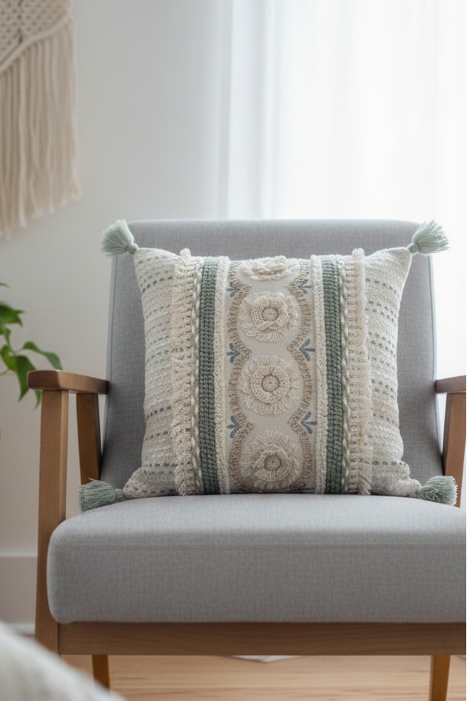 Story of the product: This exquisite cushion cover drew inspiration from a tropical island. Captivated by the undulating waves crashing onto the sandy shore, and the delicate 3D trinkets they found while exploring the island. They decided to incorporate these elements into the cushion design, using jute loops to create the wave-like pattern and adding lace embroidery and manual loops for intricate detailing. The result is a stunning display cushion that captures the essence of a tropical paradise.