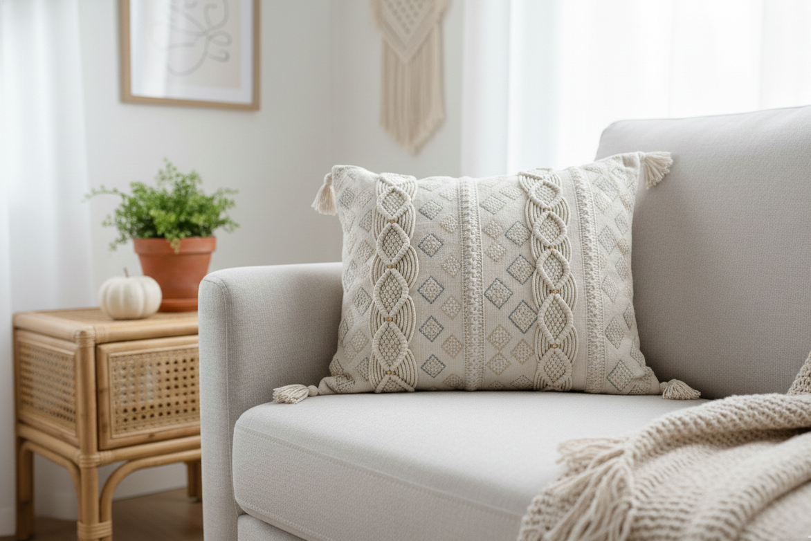 Craftsmanship of the product: This handmade cushion cover features sixty hand-cut pieces of cotton netting, adorned with blue-colored embroidery. The base cushion is further enhanced with two hand-knotted macramé belts, embellished with gold beads. To achieve a balanced look, the base fabric is overlaid with various lace and yarn attachments, resulting in an exquisite design with a touch of sophistication.