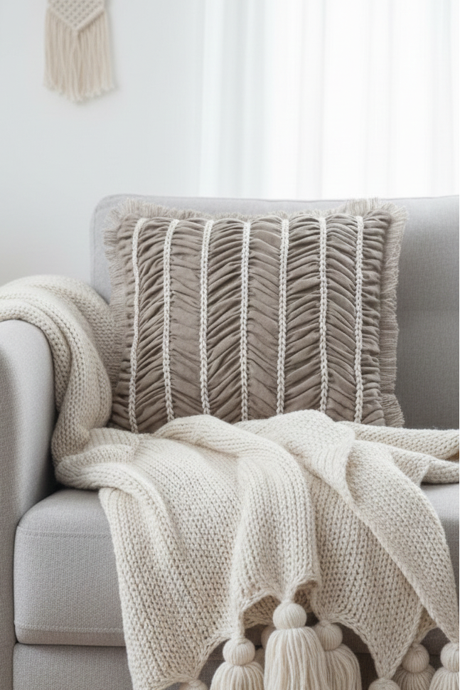 Craftsmanship of the product: First, the fabric undergoes dyeing, followed by a stone wash for a desired effect. Artisans gather 2 to 2-meter-long fabric lengths, skillfully folding them into multiple zigzag waves, creating a stunning 3D pattern. The result is a unique cushion with a captivating aesthetic achieved through intricate craftsmanship and thoughtful design.
