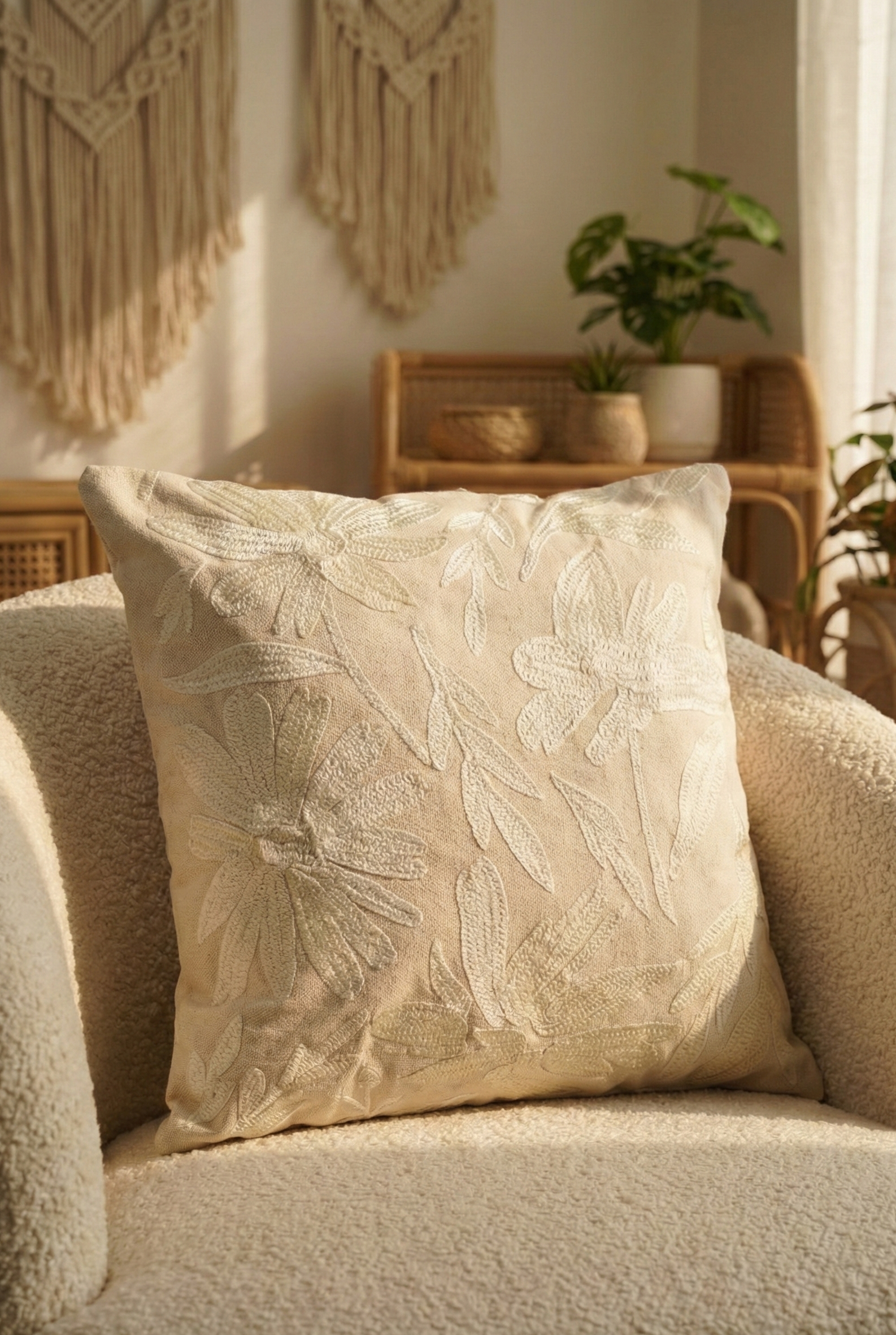 The Serenity Cushion embodies understated luxury. Inspired by wild garden florals swaying softly at dusk, the design layers tonal threads with a gentle metallic shimmer to create a quietly radiant surface. It’s a cushion that doesn’t shout — it whispers elegance. Perfect for neutral interiors that crave a touch of refined sparkle without overwhelming the space.
