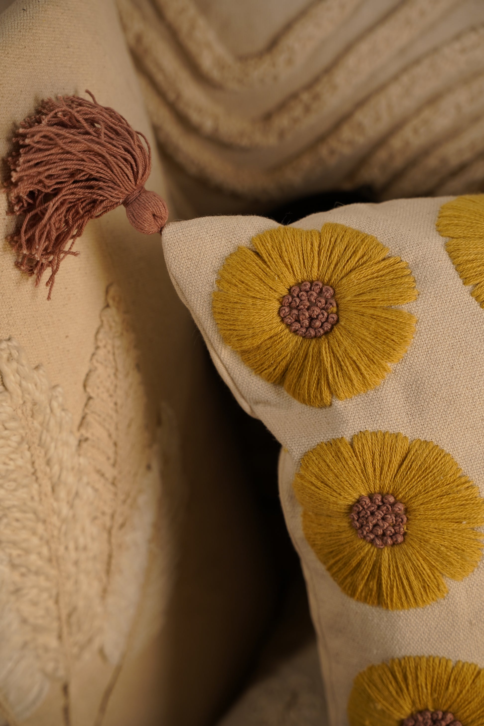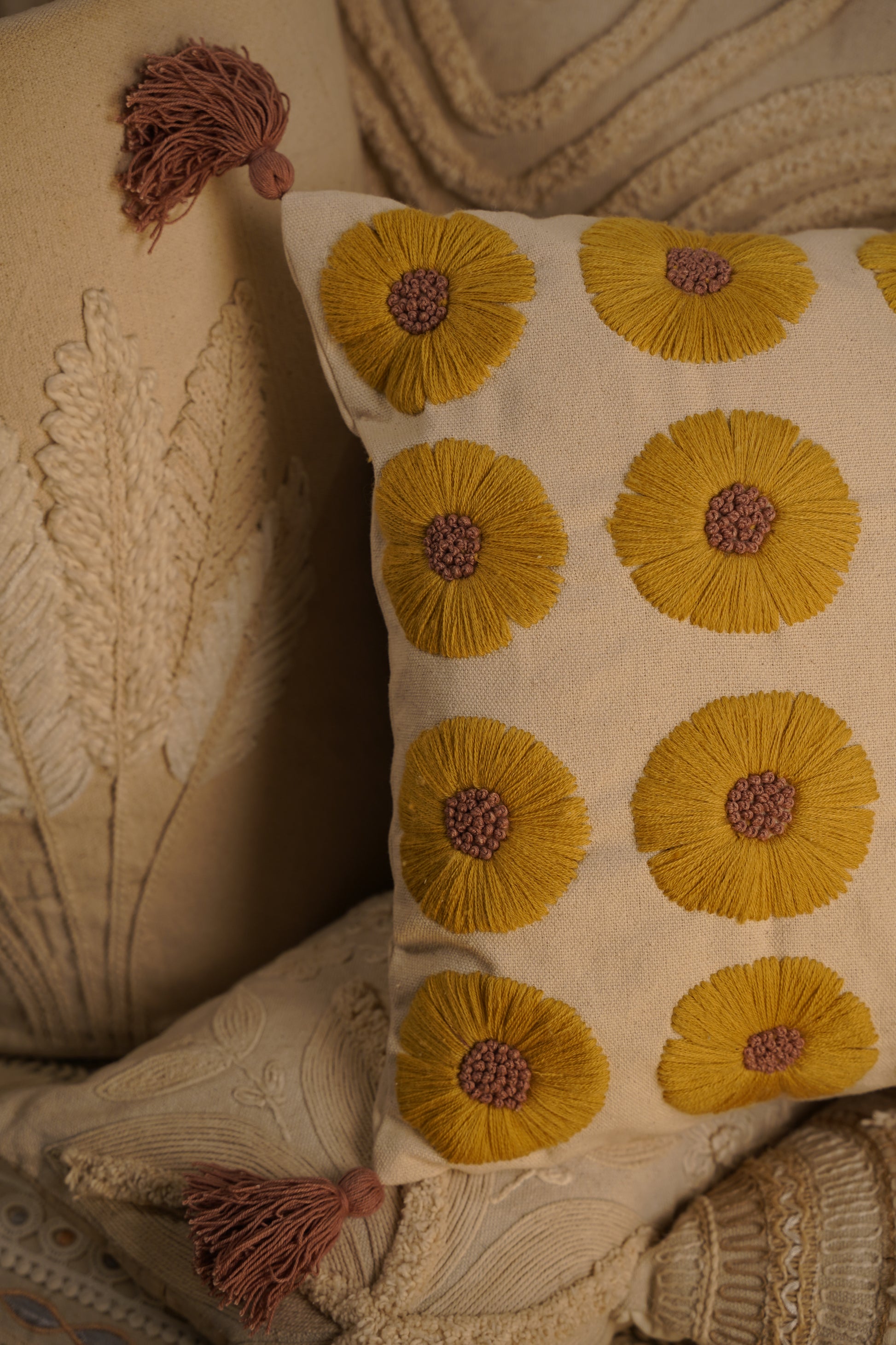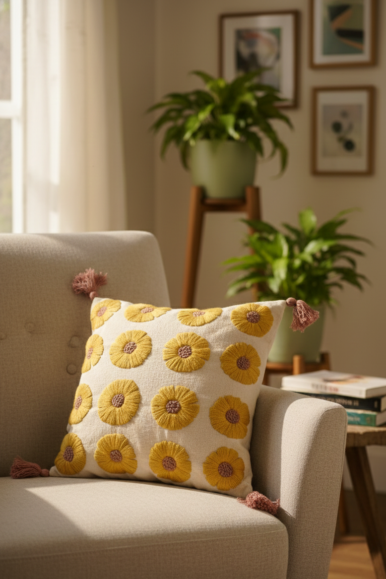 The Marigold Mosaic Cushion draws inspiration from fields of marigolds arranged in perfect rows, symbolizing festivity, joy, and timeless beauty. Its repeating circular floral motifs bring a structured yet playful charm to any interior. With warm yellow tones and a soft natural base, this design adds brightness and rhythm to spaces, whether placed on a sofa, accent chair, or bed.