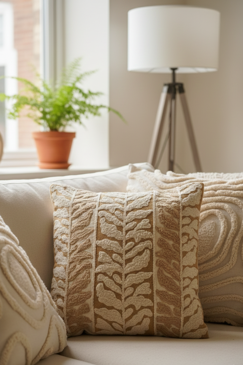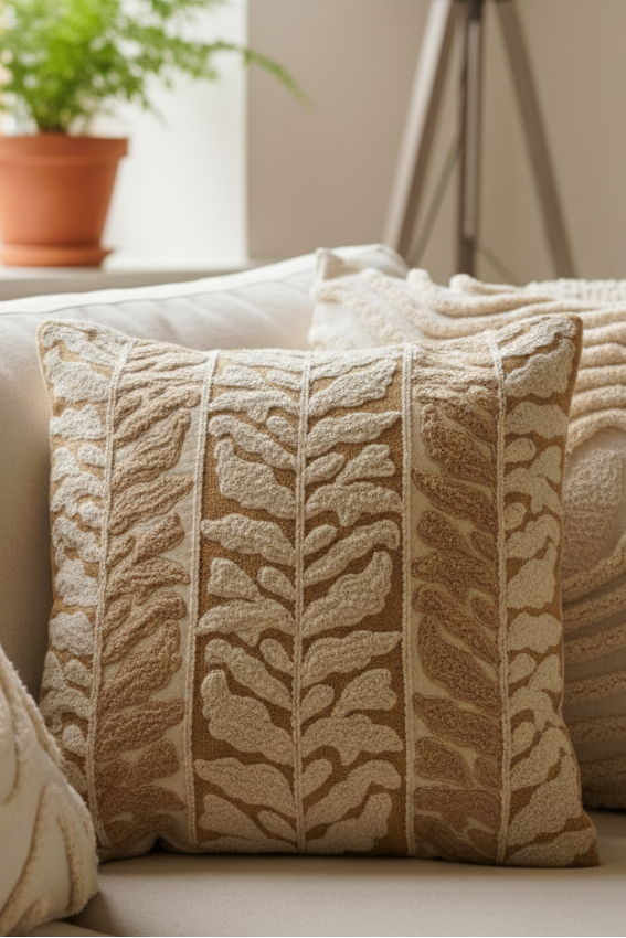This cushion is a quiet celebration of nature’s patterns—leafy silhouettes arranged in calm, vertical panels that feel both earthy and architectural. The warm sand-and-ivory palette blends seamlessly into neutral interiors, while the raised botanical motifs add depth you can see and feel. It’s designed to bring a grounded, textural softness to your space—perfect for layering on a sofa or bed when you want warmth without loud colour.